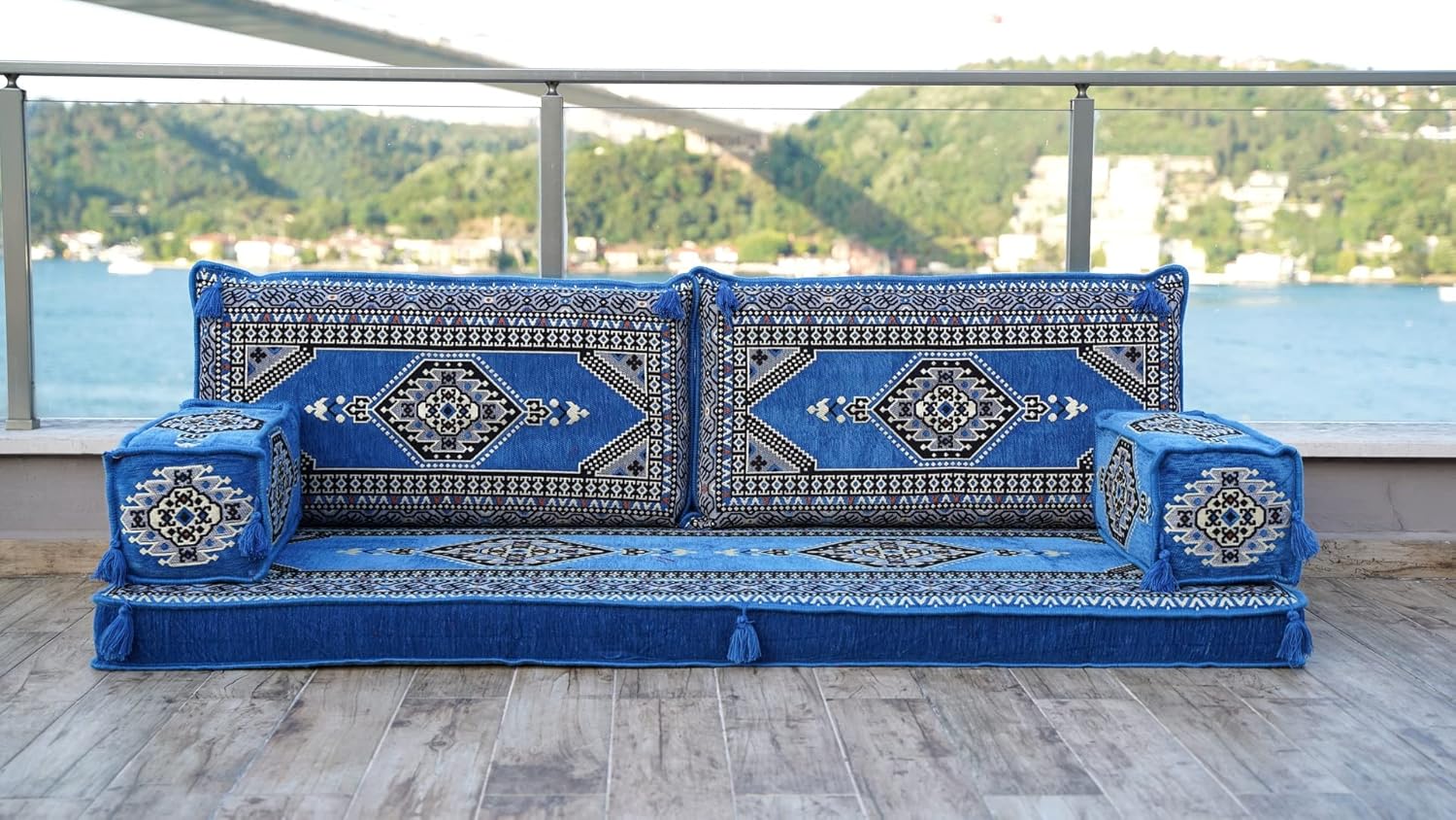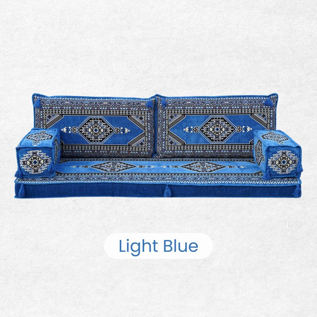 Bring elegance and comfort to your home with our Traditional Arabic Majlis Floor Sofa Set. Perfectly designed for floor seating, our handmade sofas embody the timeless beauty of Arabic furniture. Inspired by classic jalsa and majlis seating styles, this versatile floor couch offers a cozy and luxurious addition to your living room or lounge. The high-quality craftsmanship and luxurious cushions ensure comfort and durability, while the traditional Arabic design adds a cultural touch to any space.Please Note: You will receive the exact configuration and cushion thickness of the variant you select from the listing page.What’s Included in Your Set?-1 Floor Seating Cushion (190 x 70 x 10 cm / 75 x 27 x 4 inch)-2 Backrest Pillows (95 x 40 x 10 cm / 37 x 16 x 4 inch)-2 Armrest Pillows (50 x 20 x 20 cm / 20 x 8 x 8 inch)This sofa set comes in 5 separate pieces.