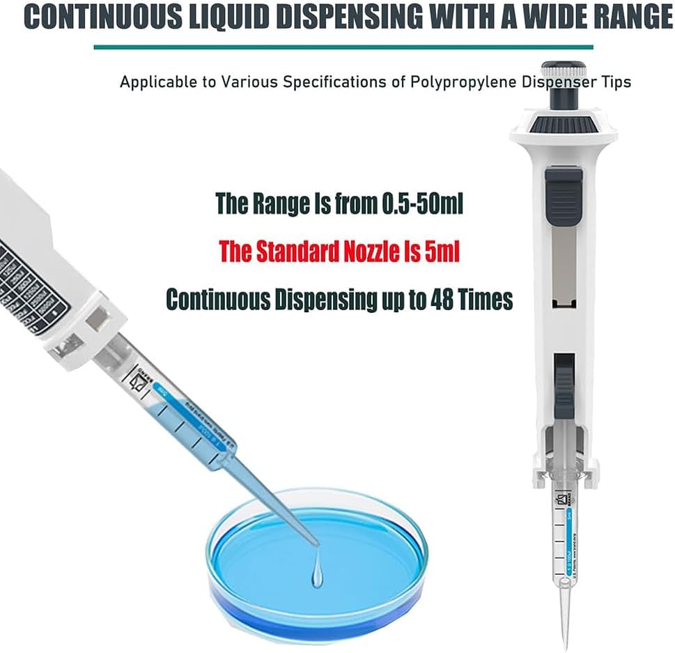 Introducing our versatile Continuous Pipettes, designed to enhance your laboratory experience with ease and precision. These pipettes are engineered for one-handed operation, significantly improving safety during experiments and allowing you to focus on your work without distraction. With five adjustable gears, our pipettes cater to a wide range of pipetting volumes, making them suitable for various applications—from routine lab tasks to more complex experiments. The gear position visual window provides clear visibility of your selected setting, enabling quick adjustments and ensuring efficiency in your workflow. Crafted for durability, our pipettes feature a nozzle connection that boasts high chemical resistance, allowing you to work with a variety of substances while easily monitoring the sealing condition. The tip locking lever ensures that your dispenser nozzle remains secure, providing confidence during use. Whether you're in a research lab, a clinical setting, or an educational environment, our Continuous Pipettes are an essential tool for accurate and reliable liquid handling. Please note that an adapter is required when using 20/50ml pipette tips, ensuring compatibility with your lab accessories. Specifications: - Adjustable Gears: Five Levels - Number of Drains: 48/23/15/11/8 (corresponding to 5 gears) - Total Volume Range: 0.5-50ml - Standard Pipette Tip: 5ml (Range: 1ml-5ml) Included in the package: - Continuous Allocator x1 - 5ml Pipette Tip x1 Elevate your laboratory efficiency and precision with our Continuous Pipettes, the perfect blend of functionality and convenience for any scientific setting.