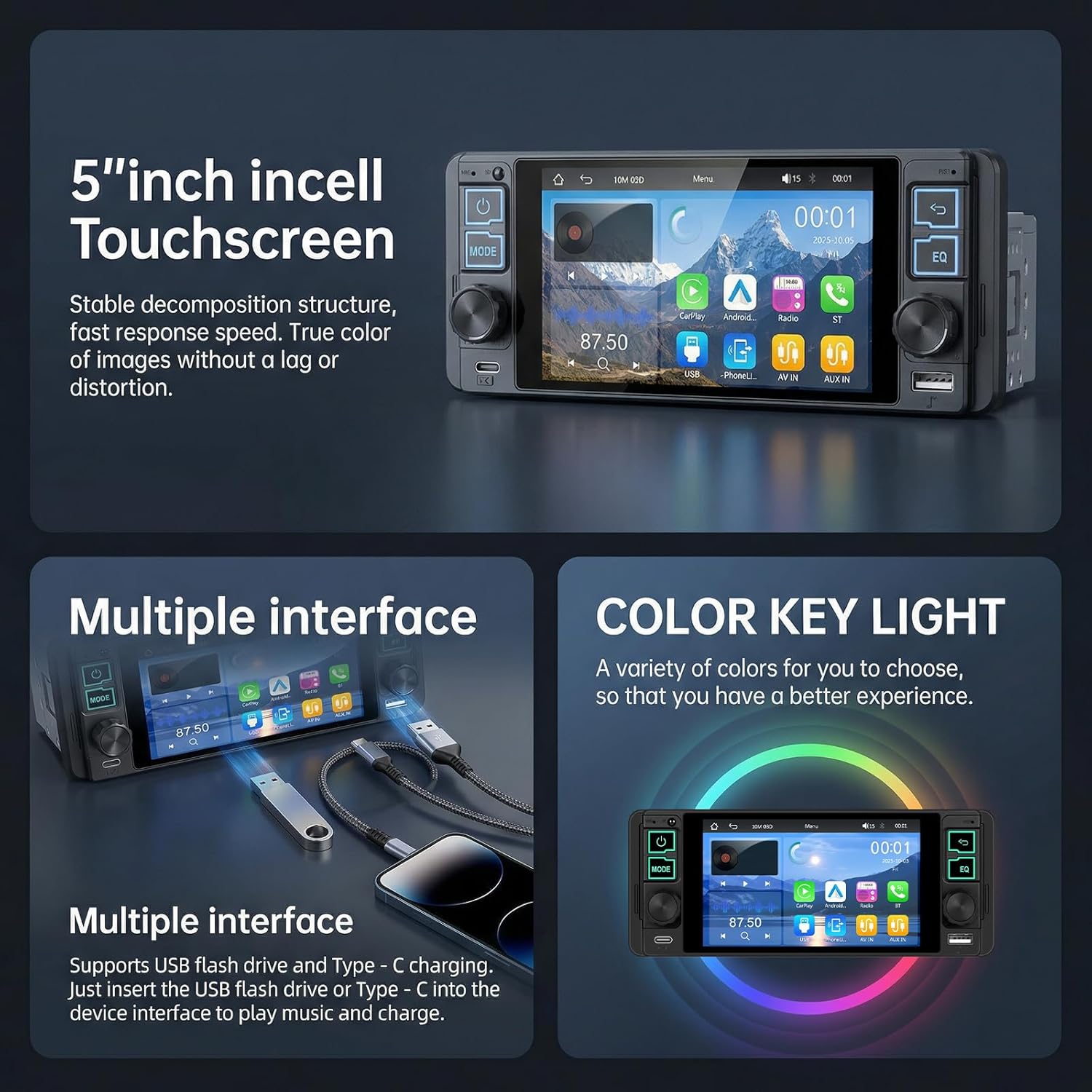 | Additional Features | Android Auto, Apple CarPlay, Built-In Bluetooth, Incell Screen, Steering Wheel Control |