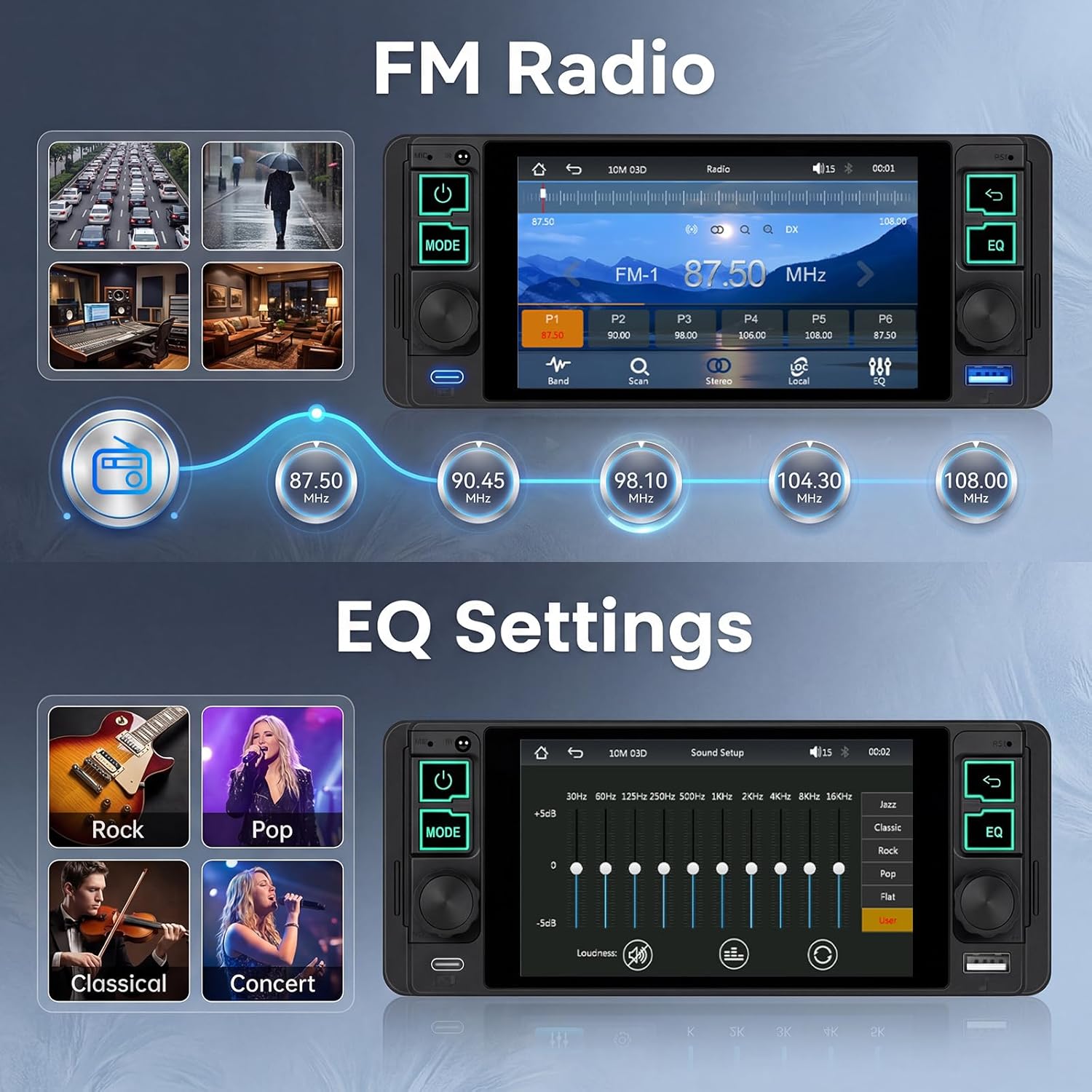 Specificsscreen material :incellVoltage:DC12VCPU Chip: F133Screen size: 5.1'' Screen resolution: 854*480Radio Band:FMRadio Chip:4732Power output:45W*4Work temperature: -10~60℃Bluetooth Version: 5.2Reversing input: CVBSPower amplifier chip:TDA7388Radio frequency:87.5-108MHzAudio format:MP3/WMA/WAV/APE/FLACVideo format:RM/RMVB/AVI/MP4/MKV/3GPPicture format: JPG BMP PNGlanguage: English/Chinese/Spanish/Portuguese/Russian/Italian/German/French/Turkish/Czech/Arabic/Polish/HebrewPackage Included:1 x Car MP5 Player1 x Power Cable1 x Horn Cable1 x MIC1 x User Manual1 x Backup Camera