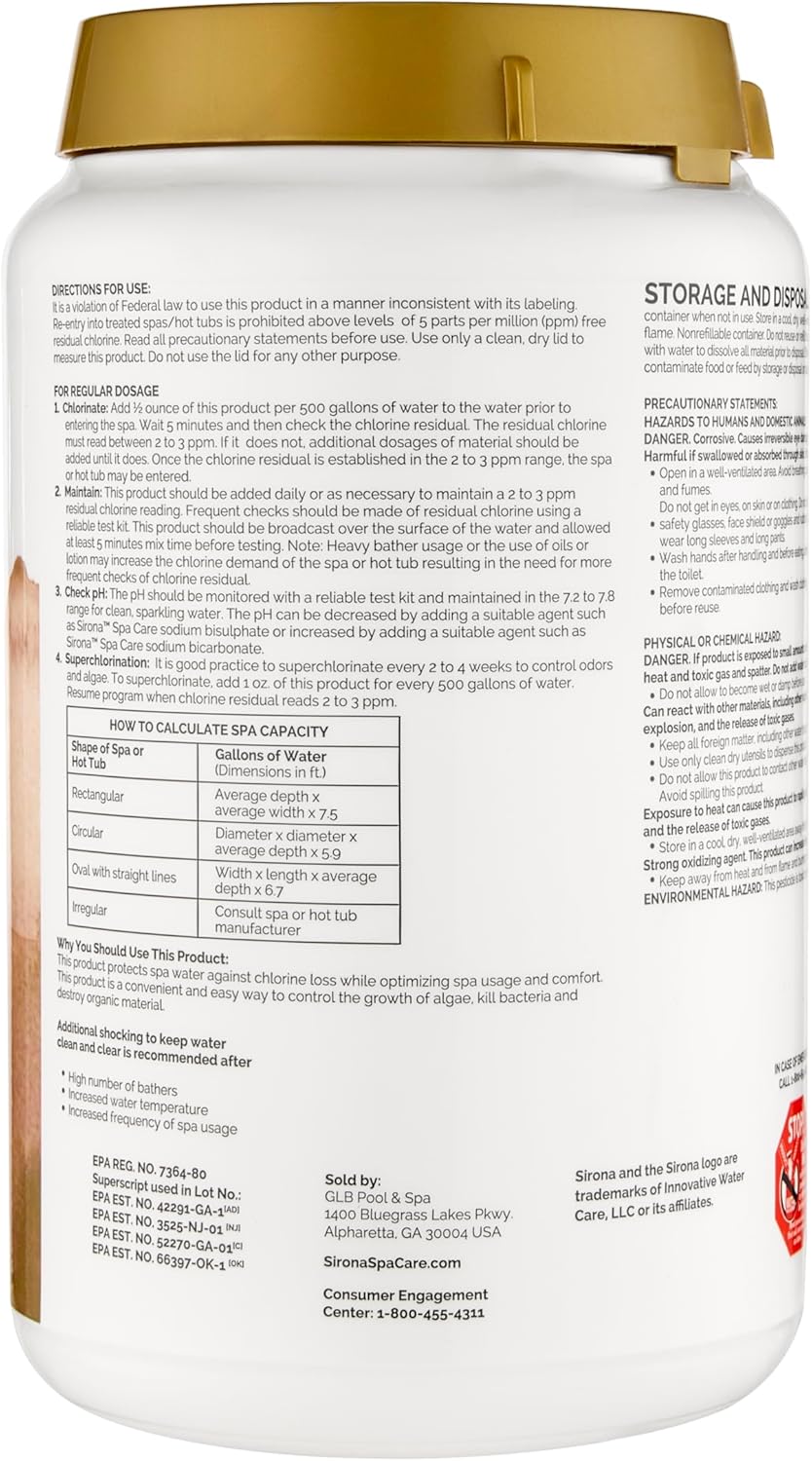 Maintain your spa or hot tub with Sirona 82132 Chlorinating Granules. This 4-pound container offers a fast-dissolving, stabilized chlorine formula designed for effective sanitation and shock treatment. Regular use helps manage water quality, contributing to a pleasant spa experience.This bundle includes the QueBuy Pool Maintenance Log Book, a valuable tool for tracking water care routines. By recording maintenance activities, you can better manage your spa's condition. The granules are compatible with various spa and hot tub systems, providing versatility in application.