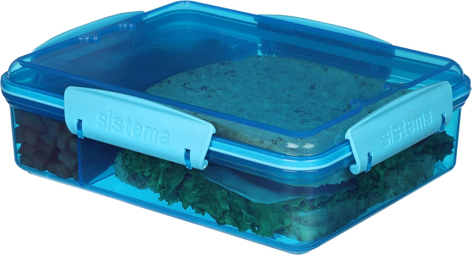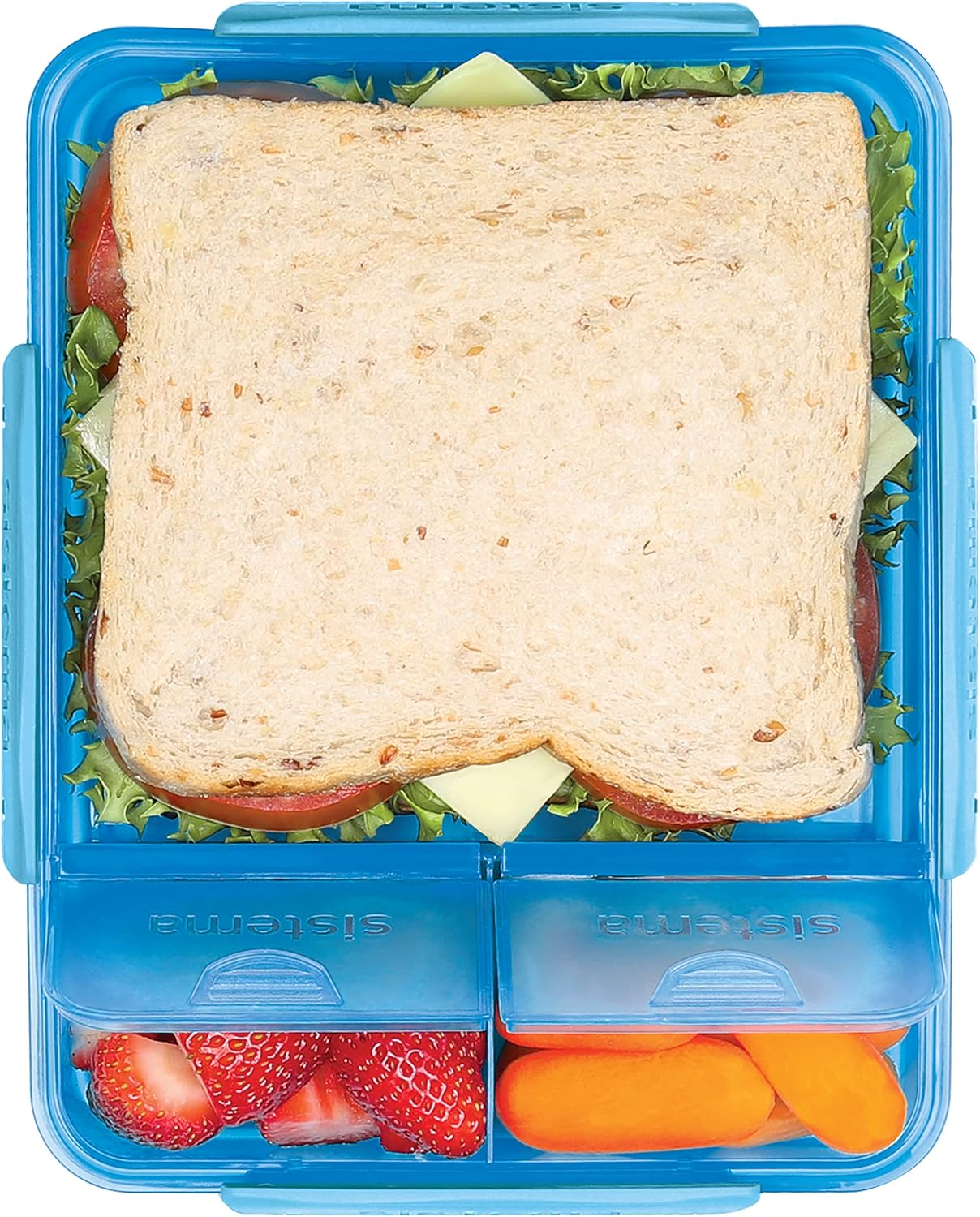 Snack container is part of the Sistema Lunch range and has been specifically designed for snacks on the go. ideal for school, office, picnics and days out. Features two separate compartment for dips, hummus or smaller items of fruit. Main compartment ideal for sandwiches and other packed lunch items. Top rack dishwasher, microwave (without lid) fridge and freezer safe. Matching Sistema water bottles are available. Phthalate and BPA free. Designed and made in New Zealand.