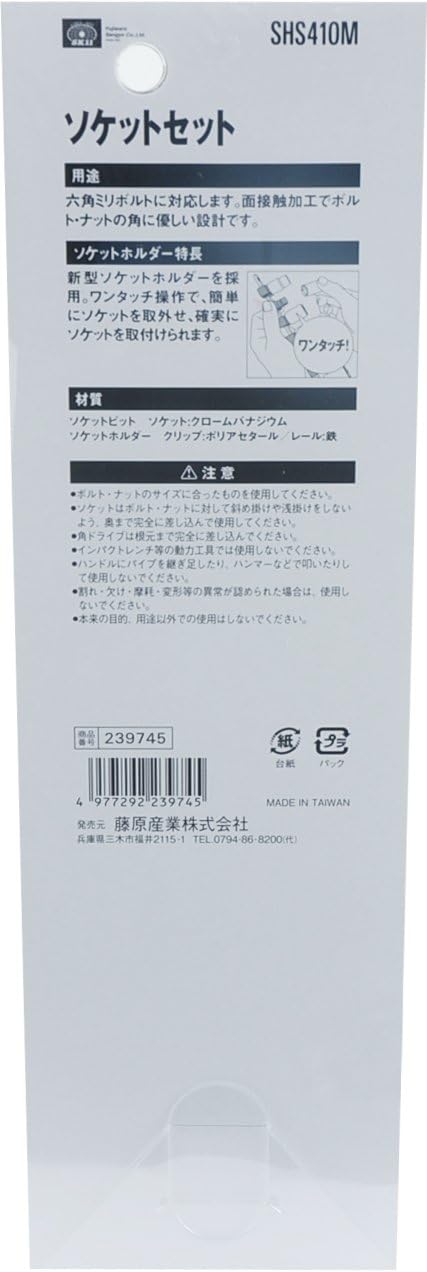 Surface contact processing and designed to be gentle on the corners of the bolt. [Use] Tightening and loosening hex millibolts. Features: Adopts a new type of socket holder. One-touch operation allows you to easily remove the socket, and securely attach the socket. Compatible with hex bolts (mm) The socket uses chrome vanadium steel for superior strength and impact resistance. [Precautions] Please use bolts and nuts that match the size. Please insert the socket completely into place to avoid cross-body hanging or shallow against bolts and nuts. Please insert the square drive completely to the base. Please do not use with power tools such as impact wrenches. Please do not add pipes to the handle or strike them with a hammer. Please do not use if you notice any abnormalities such as cracking, chipping, wear, or deformation. Please do not use for anything other than the intended purpose.