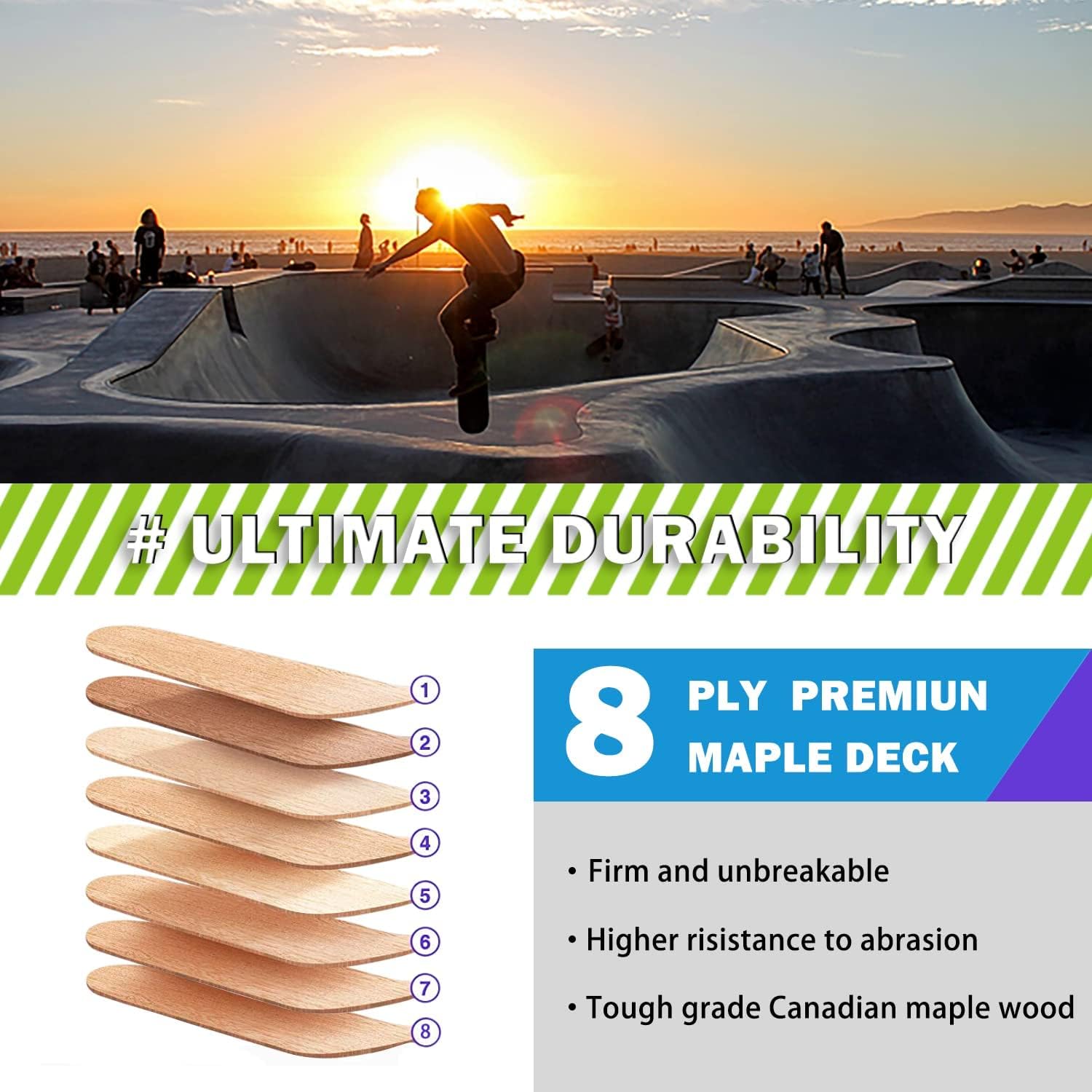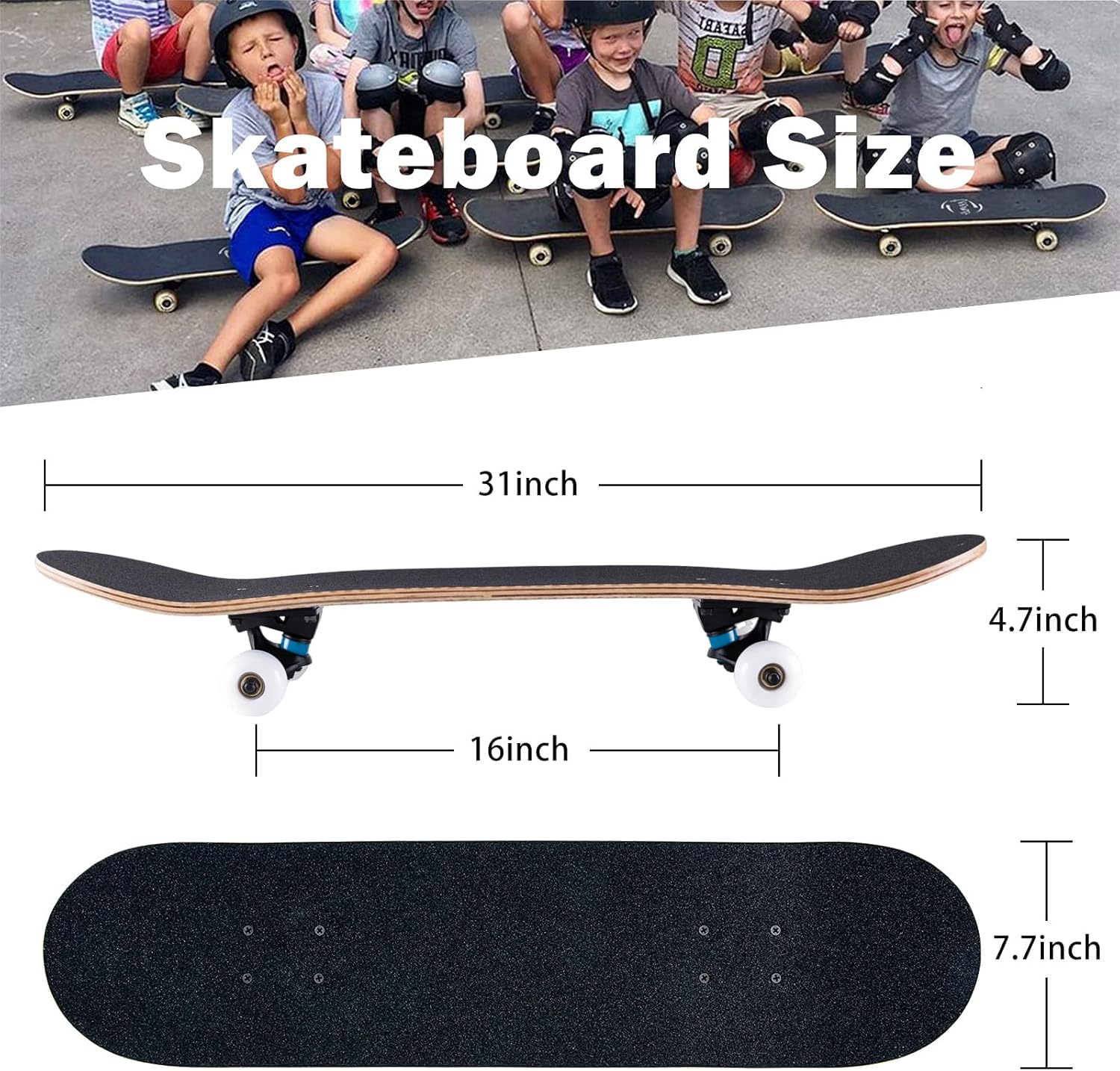 Skateboard,31 x 8 Inch Complete Skateboard, 8-Layer Maple Wood Deck Double Kick Standard Skateboards for Kids, Teens, Adult, Beginner. Shelf: approx. 31 x 8 inches (L x W). Material: 8 layers of maple wood. Wheels 52 x 32 mm, 95A PU slip wheel. Truck & Base: 5" Aluminum Alloy Wheels: 95A high rebound PU. Bearings: ABEC 11 precision ball bearings.