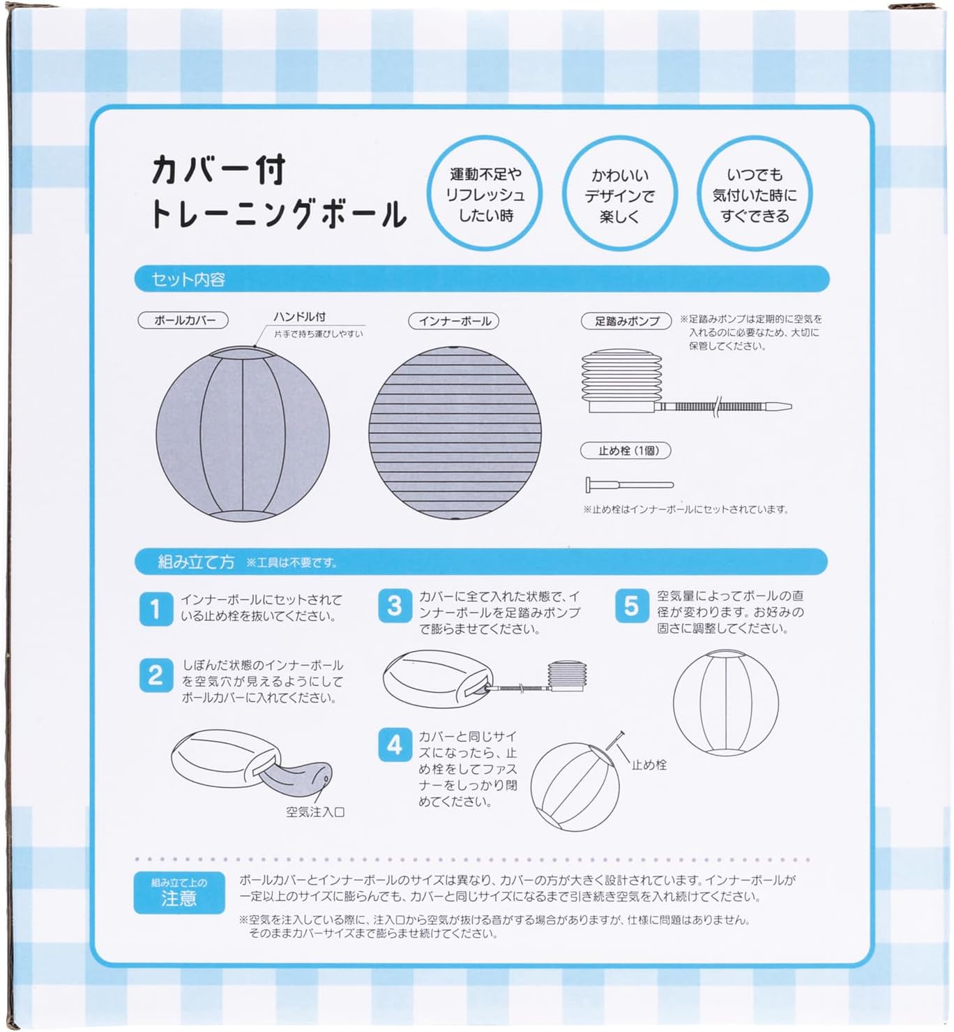 Fun and training time at home. This is a balance ball with cute character steering wheel cover. Lack of exercise and refresh. Foot pump included The cover is removable and hand washable. Please avoid using a washing machine, dryer or iron.