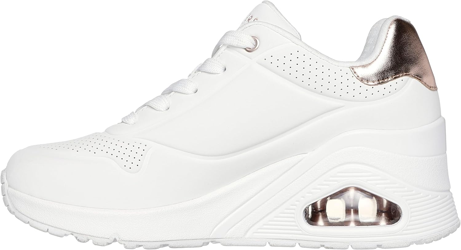 Elevate your professional wardrobe with these dress shoes for women from Skechers Street UNO collection. These formal shoes for women combine style and comfort with a fashionable wedge design. The Uno Wedge HI Steps features a sophisticated durabuck upper with metallic duraleather trim, Air-Cooled Memory Foam insole, and a platform wedge with air-cushioned midsole. Perfect office shoes for women seeking both elegance and all-day comfort with its 2-inch heel height and flexible traction outsole.