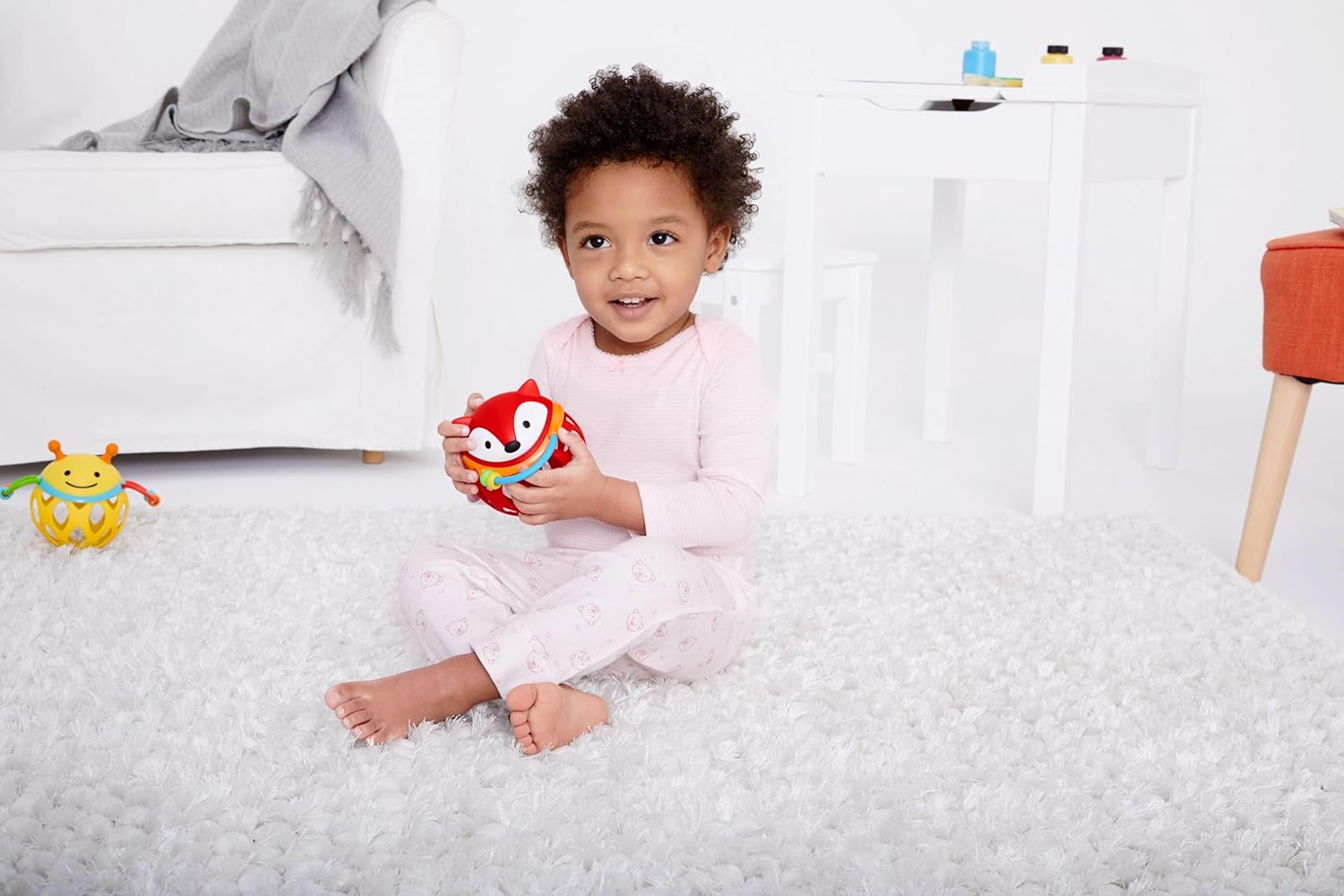 This familiar face engages baby in developmental play. The flexible body has easy-to-grasp openings that help little hands build dexterity. The rattle encourages rolling, shaking and tossing, while teethable surfaces and colorful beads offer more to touch and explore.