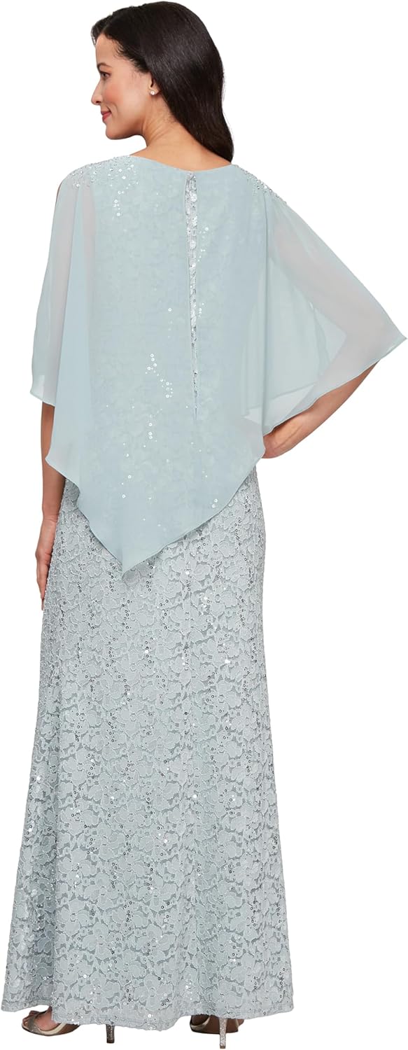 The S.L. Fashions Women's Long Length Sequin Lace Beaded Capelet Dress exudes timeless charm and glamorous allure. This one-piece marvel features a boat neckline and intricate sequined lace, complemented by a chic chiffon overlay and beaded shoulder detail. The attached asymmetrical cape enhances the dress's sophistication, making it perfect for formal evenings and special occasions. Crafted from soft lace and chiffon, this gown offers luxurious comfort with its flared skirt and convenient zipper closure. The floor-length design, combined with the sparkling sequined lace, ensures effortless elegance and sophistication for any event.