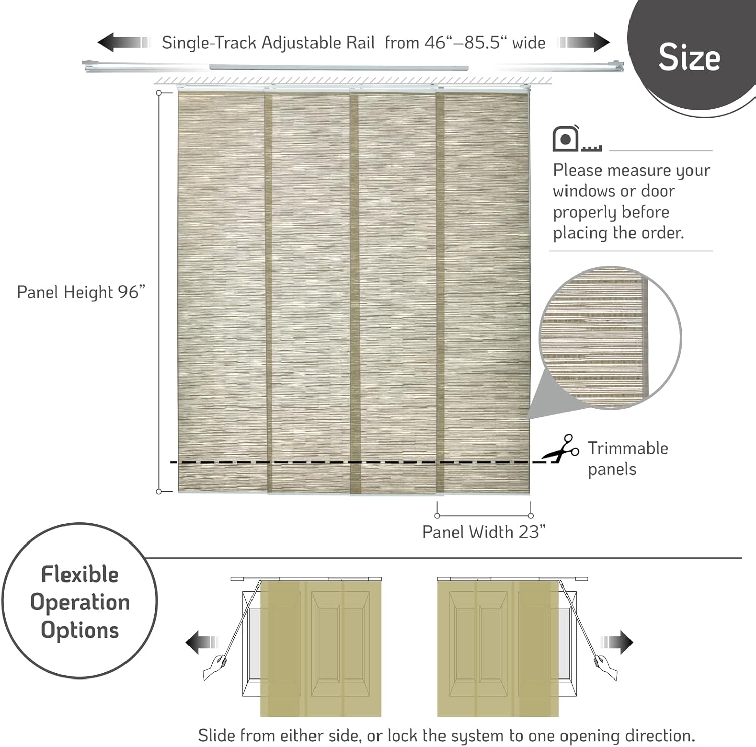 | Additional Features | Adjustable Track, Cordless, Reinforced Edge, Smooth Glide, Trimmable Panels |