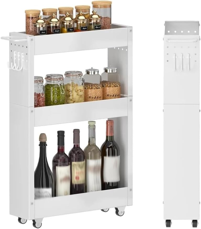 3 tier slim storage cart will turn a tight space just 5 wide into organized storage. Front sealing plate and top wood board design makes it easier to match your decorating .Three shelves and top board designs that can store items of different heights up to 13 . Great rolling shelf storage organizer for kitchen spices, canned foods, laundry supplies, or bathroom necessities.The narrow rolling cart fit in between cabinets and refrigerators, washer and dryer, desk and wall, near the table or countertop, and organize wasted space. With 1 handle and 4 heavy duty line wheels, which can be easily slided in-out for use. NOT recommended for use in areas.This slim laundry room organization is made of all steel excluding board top, structured with heavy sturdy frame.allow you to have this cart in your dry or other wet places for years.Quick and easy snap together assembly. – measures 16.7"D x 5"W x 27.17"H\, hold up 80 lbs–. Extra 3 pcs pegboard hooks fit for hanging some sachets and small items.for Kitchen Bathroom Laundry Narrow Places.Description:Product Dimensions: 16.7"D x 5"W x 27.17"HShelf Type: Tiered ShelfFrame Material: MetalColor: WhitePackage: 1 pcs cart (Does not include other demo goods)1. Due to light and screen differences, the color may be slightly different from the picture.2. Due to manual measurement, please allow 1-3 cm difference.3. Thank you for your understanding.Easy Assembly: Comes with clear instructions and tools for hassle - free setup. With rounded edges on baskets and an ergonomic height, this microwave table ensures safe, comfortable use
