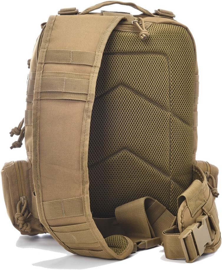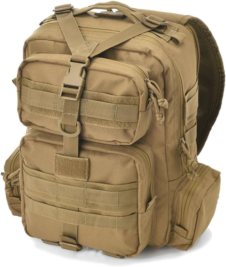 Tactical Sling Bag Pack Military Rover Shoulder Sling Backpack with USA Tactical Flag Patch Sling pack is made of 600D fabric, water-resistant and durable.Tactical sling pack's size: 14 * 12 * 7 inch (H*W*D), enough for carrying 14"laptop,iPad, notepad, goggles, book, keys, wallet, cell phone, flashlight, gloves, water bottle, chargers etc on a daily basis Tactical sling backpack with velcro in the concealed back compartment as a pistol sling range bag for 1-2 handguns.Sling backpack has adjustable and comfortable single shoulder strap, and also has waist strap to help reduce the sway of the bag while moving.Tactical sling hydration pack has hydration compartment that works great for a 2.0L hydration bladder (bag didn't include hydration bladder) Tactical sling pack with double-stitched, Heavy duty zippers and utility-style cord pulls, front load compression system-Y strap. Comfortable breathable padding back area, molle straps and both side pockets as molle tacticla sling pack or edc bag.