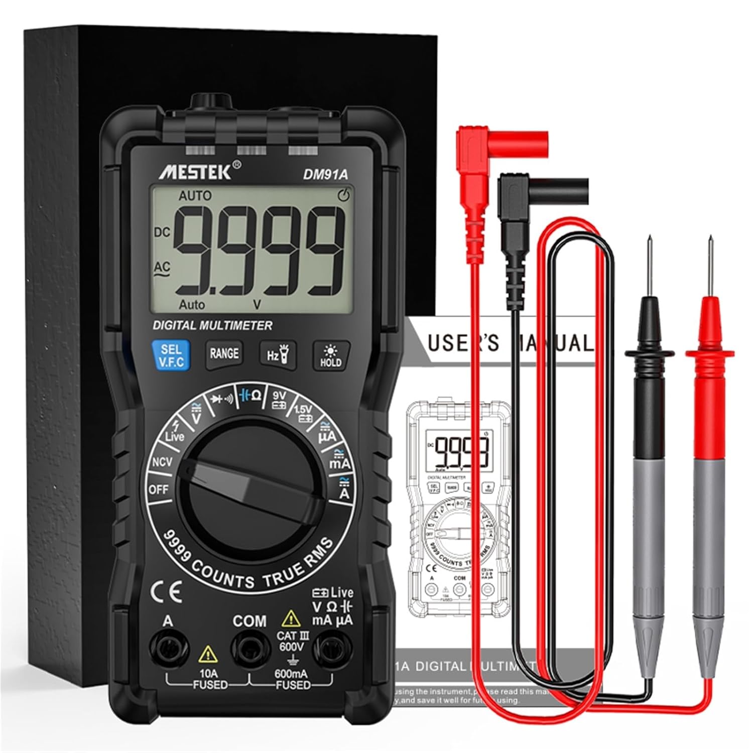 Multi TestersModel Number : DM91APlace of Origin : Guangdong, ChinaDimensions : 150*70*50mmFeature : otherMax. AC Current : 10AMax. AC Voltage : 600vMax. DC Current : 10AMax. DC Voltage : 600 VMeasuring Capacitance Range : 9.999nF~99.99mFMeasuring Inductance Range : multimeterMeasuring Resistance Range : 999.9~99.9MOperating Temperature : 0~40Color : Black+BlueDisplay : LCD displayBacklight : YesCount : 10000 countsOperating Mode : auto rangeOperating Environment : IEC61010-1,CAT III 600VCapacitance Resolution : 0.001nF/0.01nF/0.1nF/0.001uF/0.01uF/0.1uF/0.001mF/0.01mFNCV : YesName : digital multimeterUsage : multi meter