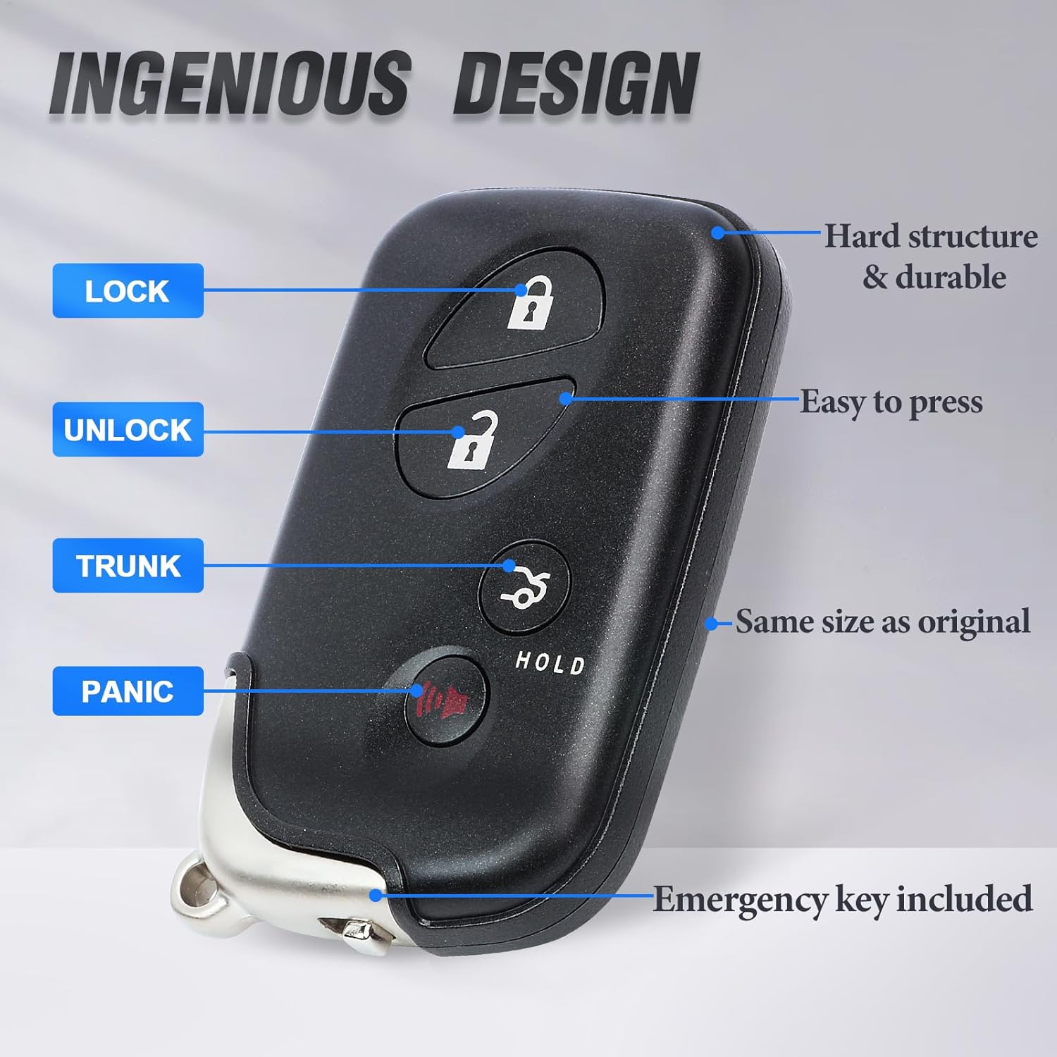 Specification: FCC ID:HYQ14AAB IC: 1551A-14AAB P/N:89904-50380 Board: E Board (3370) Frequency:315 MHz Buttons:Lock, Unlock, Trunk, Panic Battery:CR1632 Color:Mainly black Compatible with the following vehicles: for Lexus ES350 2009 2010 2011 2012 for Lexus GS350 2009 2010 2011 2012 for Lexus GS460 2009 2010 2011 2012 for Lexus IS250 2009 2010 2011 2012 2013 for Lexus IS350 2009 2010 2011 2012 2013 Package Includes: 1 x key fob with key blank Note: 1.The product is an aftermarket item without logo or part number on the back . If your key style (shape,buttons,blade) is different,please don't order. 2.Please find parameters on your original remote.Please compare carefully before placing an order. 3.Please make sure the remote programming can work on your vehicle before asking the locksmith to cut the key.