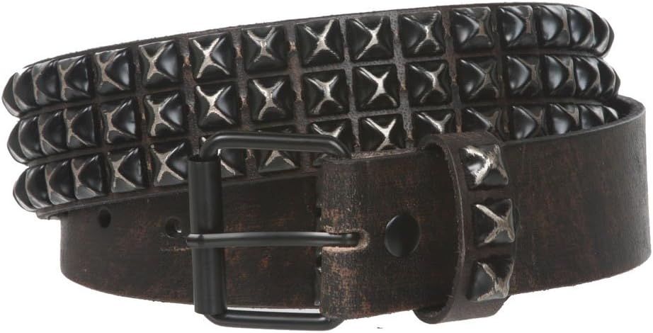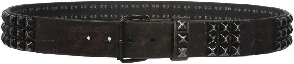 This distressed, vintage looking leather belt is made of 100% leather for durability and long lasting; This belt features the most popular three rows of distressed punk rock star BLACK metal studded hardware and also removable roller buckle with snap on feature which allows you to switch most buckles. Sizing: this belt is measured from inside edge of buckle the the center hole (the third hole from belt tip). For best fit, order 2 inches larger than pants size. e.g. Size 32 pants should order at least size 34" belt. If you want to wear this belt lower on hip than usual, even bigger size should be considered. Please refer the size chart for details. -Understand sizing: -Usually belt size is not about full length (end to end), it is sized to the center hole or the hole you are using with your existing belt. In most cases, order about 2 inches larger than pants size for best fit. -For this particular belt you may want to order about 3" or 4" larger than pants size for best fit since the heavy studs and thick leather might eat some size.