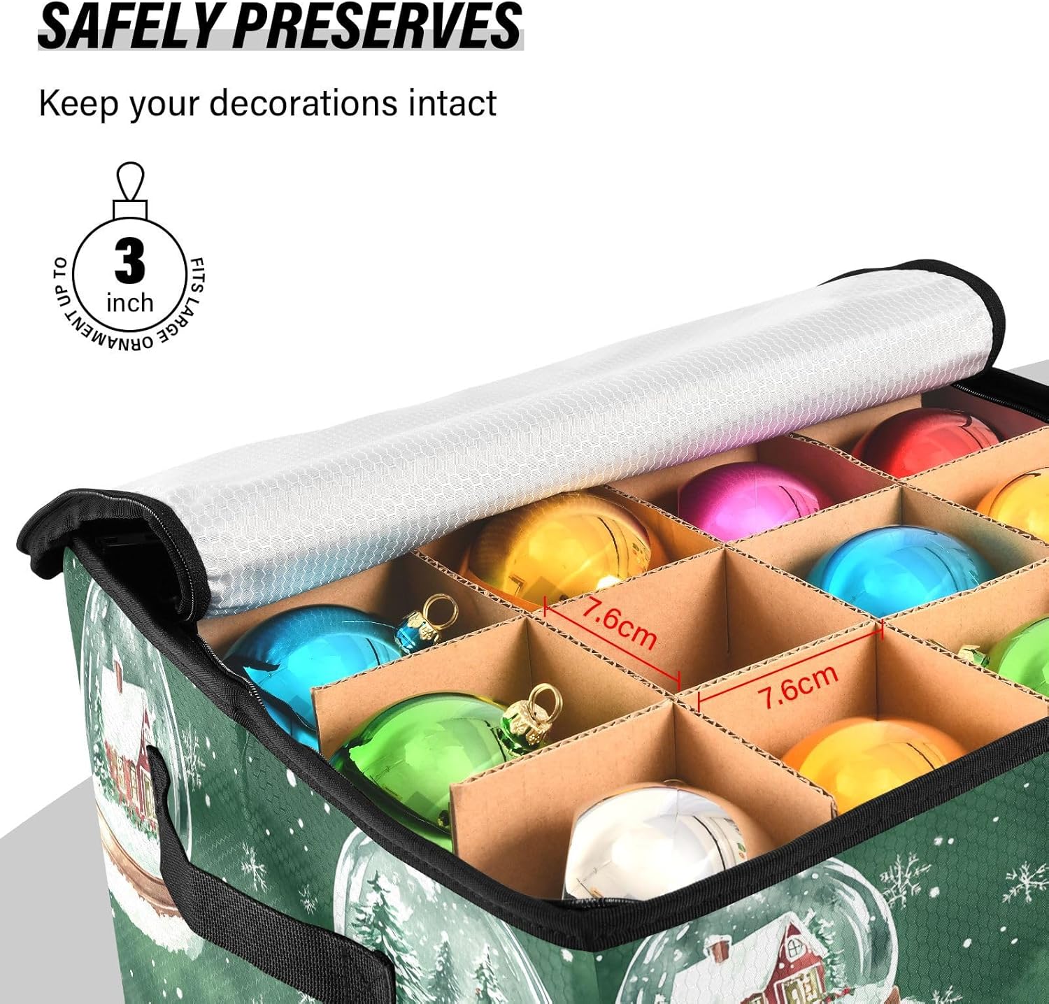 Welcome to our store and we hope you have a great shopping experience. Material: Polyester+ Hollow Sheet + Corrugated Cardboard Divider (Christmas Ball Not Included) Size: 13x13x13 inches / 33x33x33 cm Printing : Four side and flap prints, fixed white lining. Christmas Ornament Storage Box Features - Holds up to 64 - 3inch ornaments. - The surface is made of soccer-textured fabric, which is durable and sturdy, waterproof and easy to clean. - Built-in hollow board support, not easy to deform. - Small carrying handle design, easy to carry. - Foldable storage to save space. - Comes with corrugated cardboard dividers for self-assembly of compartments. - Lid design to protects decorations from dust. Applicable occasions - Perfect for storing Christmas ornaments, lights, garlands, and even Halloween decor. Quality Service - If you have questions about the quality of the goods and shipping damage, you can contact us and we will give you the most satisfactory solution. Customer satisfaction is our top priority.