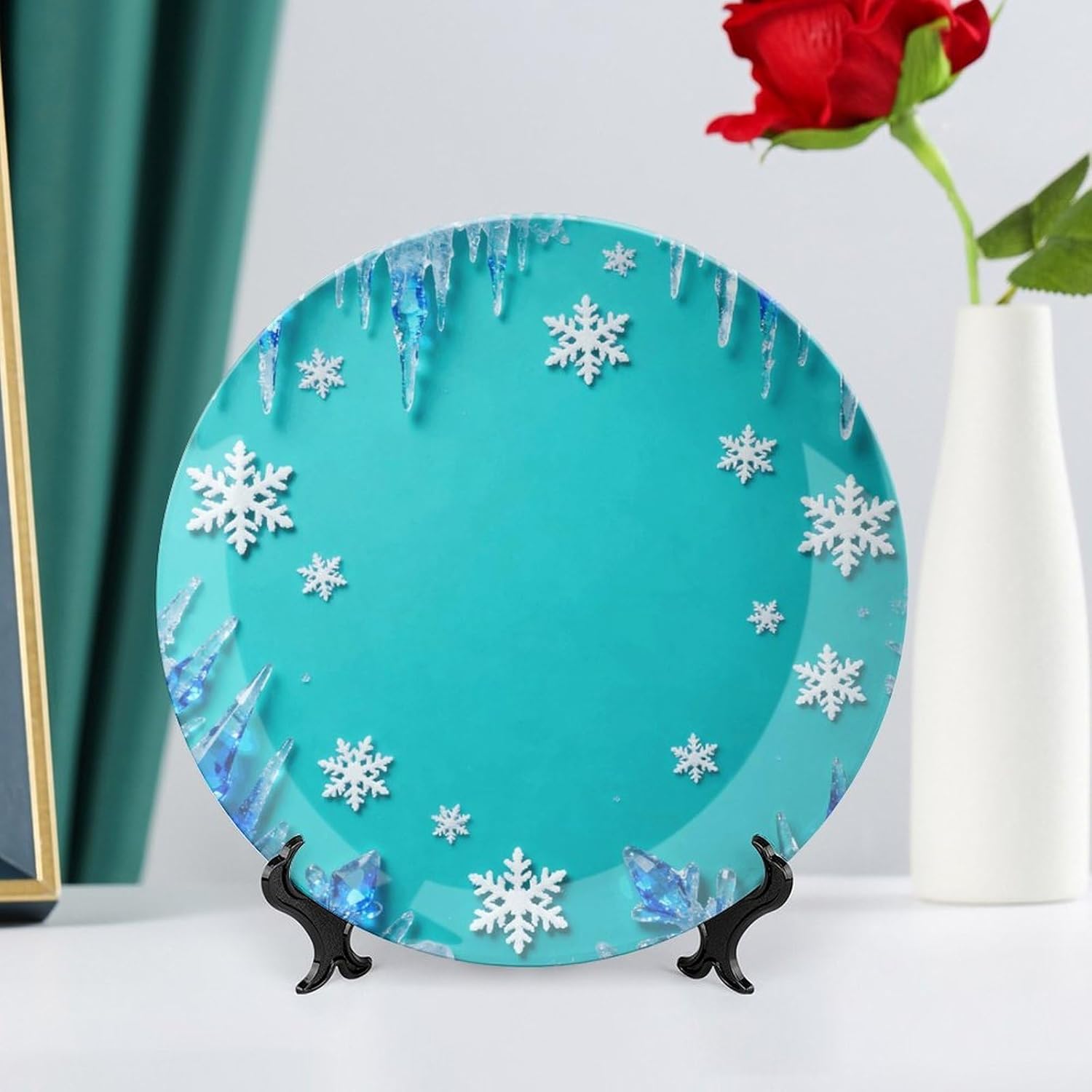 Our ornament is made of bone China material, which is sturdy and durable, and the surface is smooth and does not cut hands. Versatile to decorate your space or serve as a dinner plate. Microwave & dishwasher safe. Sturdy, fashionable at the same time, safe for everyone to use. This Snowflake & Ice disc decoration comes with a display stand, which can be displayed in a porcelain cabinet, shelf arrangement or side table. It can be placed three-dimensionally, placed on the table with the base, or hung up, easy to disassemble, both decorations are very beautiful. It is a beautiful landscape. Perfect for daily use in homes, kitchens, houses, offices, cabinets, walls, banquets, or exhibition halls, it looks very elegant and artistic, bringing vitality and color to your space. As a beautiful gift for lovers, friends, and family on special occasions or holidays such as valentine's day, mother's day, father's day, halloween, and christmas.