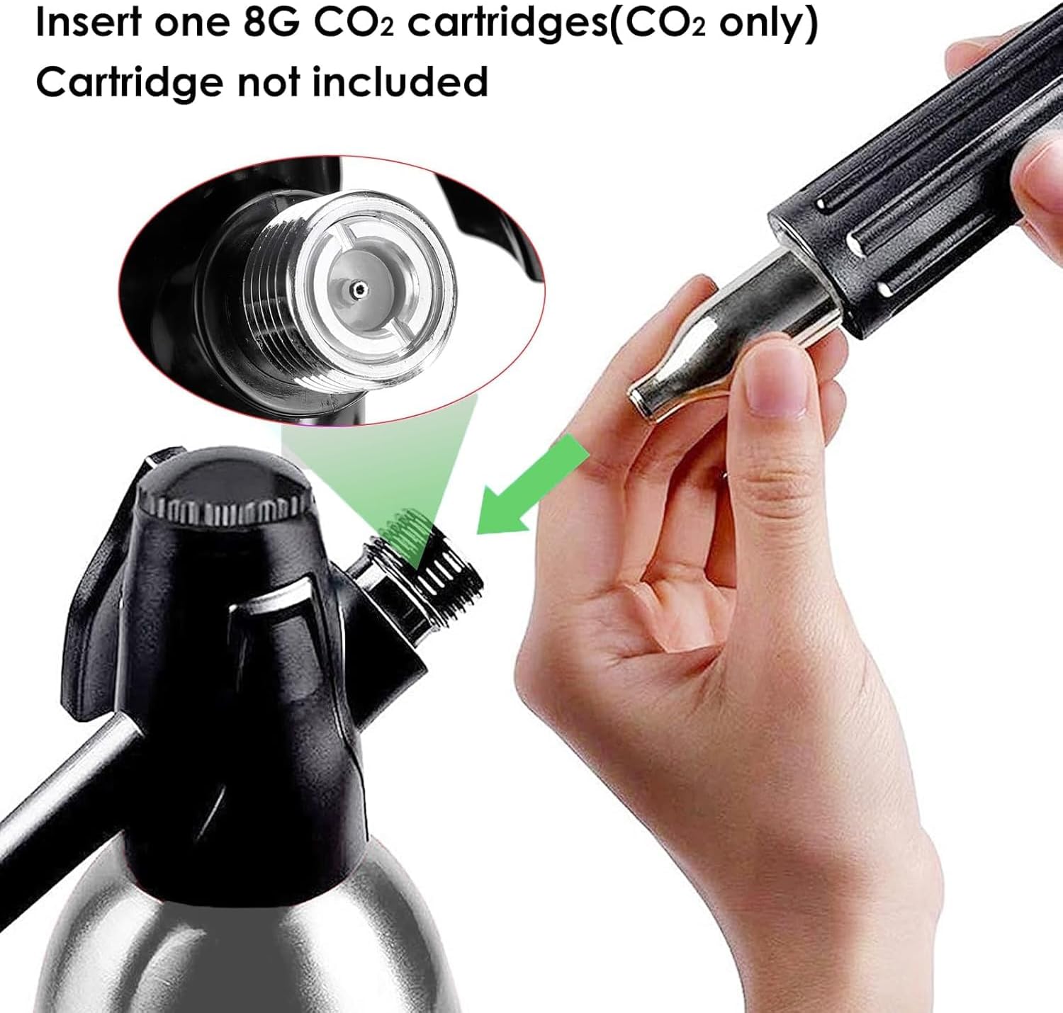 DescriptionTired of being out of soda when you want it? With this easy to use soda maker you can now make your own sparkling water at home. Just attach a standard CO2 charger (not included). You’ll be surprised at how easy it is to make seltzer water.Features- Color: Silver.- Material: Aluminum alloy, PC, PBT.- Size: 9.5 x 9.5 x 3.3 cm/ 3.7 x 3.7 x 1.3 inch.Notice:- Total 1L, not net 1L, so it ends up about 800ml of actual.- Please add less than two-thirds of the bottle's capacity when making sparkling water.- Please review included instruction and clean before use.- Avoid falling, collision, or strong impact, which may cause deformation of the bottle and affect the taste of the product.- Fill with spoiled foods such as cream, please consume and clean them as soon as possible.- Do not place the bottle around a heat source.