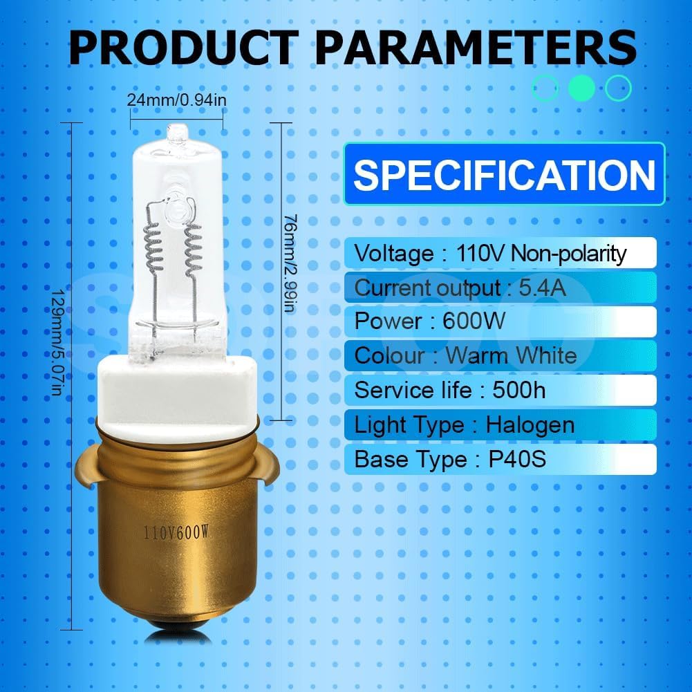 Upgrade your lighting systems with the SOFOC P40S base halogen bulb engineered for high intensity applications . This robust bulb emits a powerful warm white glow delivering 600W of brilliant illumination while consuming energy efficiently,Its specialized design allows direct replacement for P40S base halogen bulbs without rewiring saving time and installation costs . The 360 degree light distribution ensures wide coverage making it ideal for demanding environments like train front lights fog lights stage spotlights and projection lighting Crafted with durability in mind it offers a long service life of 500 hours providing reliable performance in professional settings. Each bulb undergoes strict quality checks to ensure consistent output and safety. Trust SOFOC for superior lighting solutions that combine brightness efficiency and easy integration.Specifications: Base Type :P40S Light Type :Halogen Voltage :110V Non-polarity Power :600W Color :Warm White Current output :5.4A Service life :500h Ideal For: Train fog lights, performance spotlights, stage lights, projection lights Package Includes: 1 Bulbs Backed by a one-year warranty – Order now for premium illumination!