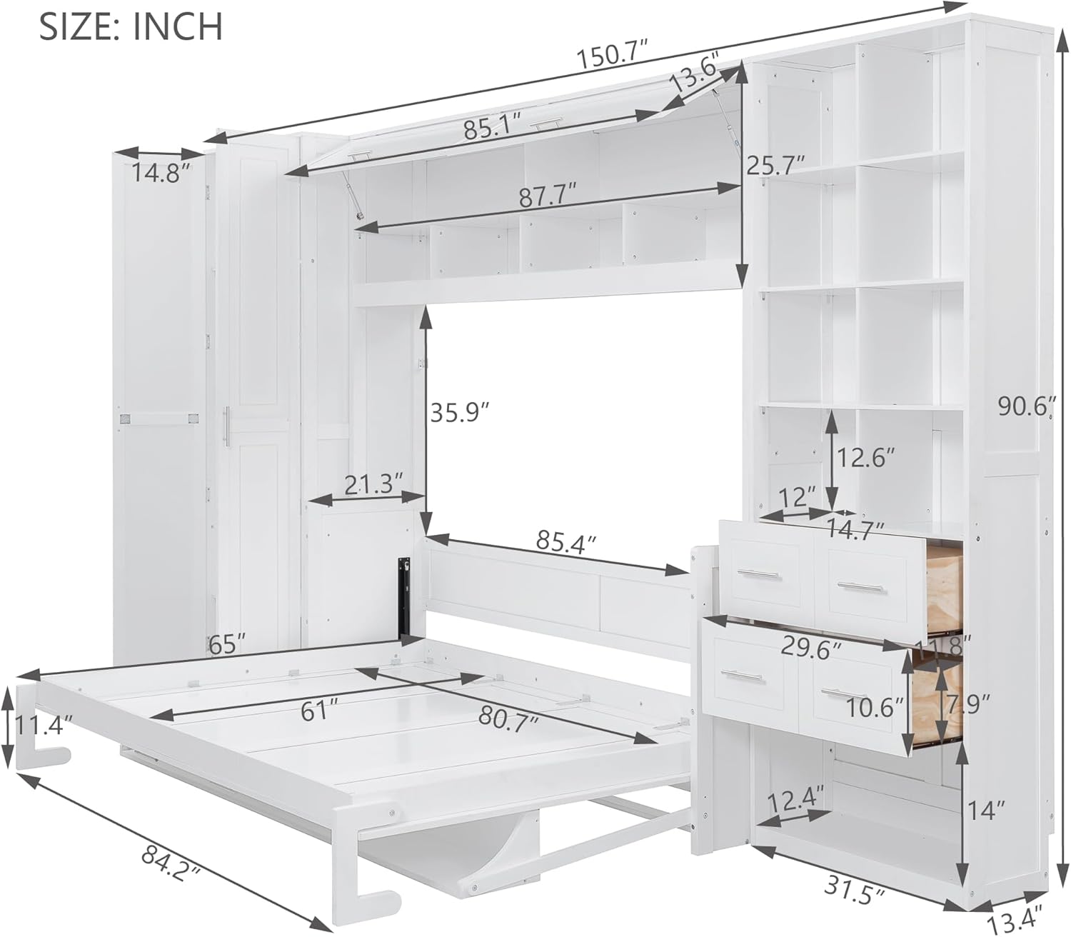 SOFTSEA focuses on providing you with high-quality furniture and is committed to bringing happiness to every buyer's life. The unique design of the Murphy bed allows it to transform into an exquisite cabinet when folded up, greatly saving space and adding more flexibility to your living space. By fully utilizing space, it makes your room more spacious and tidy.Overall Dimensions: 146"L x 13.4"W x 84"H / 150.7"L x 65"W x 90.6"H Bed Inner Space: Full/Queen Recommended Mattress Thickness: 8-10'' Bed Weight Capacity: 600LBS/750LBS Overall Product Weight: 455LBS/459LBS Color: White /GreyMaterial: Plywood + MDF Level of Assembly: Full Assembly Needed Suggested Number of People: 3 Warranty Time: One Year (Manufacture Defect) Additional Tools Required: All Tools Included Number of Package: 5 Country of Origin: Vietnam SOFTSEA Notice: All colors on our website are for reference only, actual product colors may vary a little bit, due to different color settings of every screen device. Please note: most of our furniture is hand-measured, therefore the dimensions are for reference only, and may marginally deviate.