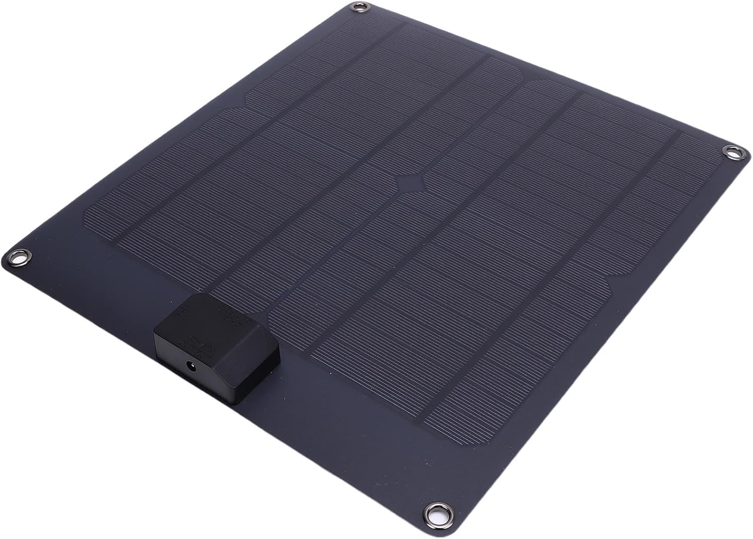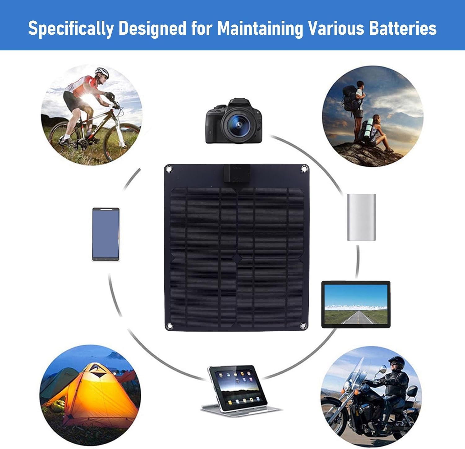 1. High Efficiency: Our solar panel features monocrystalline cells. A higher photoelectric conversion efficiency, reaching about 20%-25% under standard testing conditions. Compared to other polycrystalline and amorphous solar panels of the same size, our monocrystalline solar panel charges fast. 2. Battery Savior: Trickle charging is a slow charging method. When the charged battery is low, the charger initially provides a high current for fast charging. As the battery approaches full charge, the charger automatically switches to trickle charge mode. The charger delivers a smaller, steady current to replenish the power lost due to self discharge, keeping the battery fully charged and preventing damage from overcharging. 3. Compatibility: Use it to charge and maintain infrequently used vehicles, boats, outdoor electronics, mowers, and more. Ensure your devices start anytime and protect batteries from long term discharge. It's also ideal for off grid devices like electric fences, gate openers, water pumps, , cameras etc. Compatible with most battery likes lithium, GEL, AGM, flooded etc. Spec: Item Type: 30W Solar Panel Material: PET, EVA, TPT Solar Panel Material: High Efficiency Monocrystalline Silicon Product Size: Approx. 320x275x2mm / Approx. 12.6x10.8x0.08in Solar Panel Power: 30W Output Ports: 1 x USB, 2 x DC Features: 1. Suitable for various devices such as phones, power banks, rechargeable battery, energy storage devices, etc. 2. Built in stabilizing circuit in USB circuit box for fast charging at high current. 3. Equipped with 5A solar controller for stable and efficient charging. 4. Battery charging status indicator, red charging, green fully charged Package List: 1 x Solar Panel 1 x Controller 4 x Supply Cords 4 x Suction Cups 1 x Instruction Manual