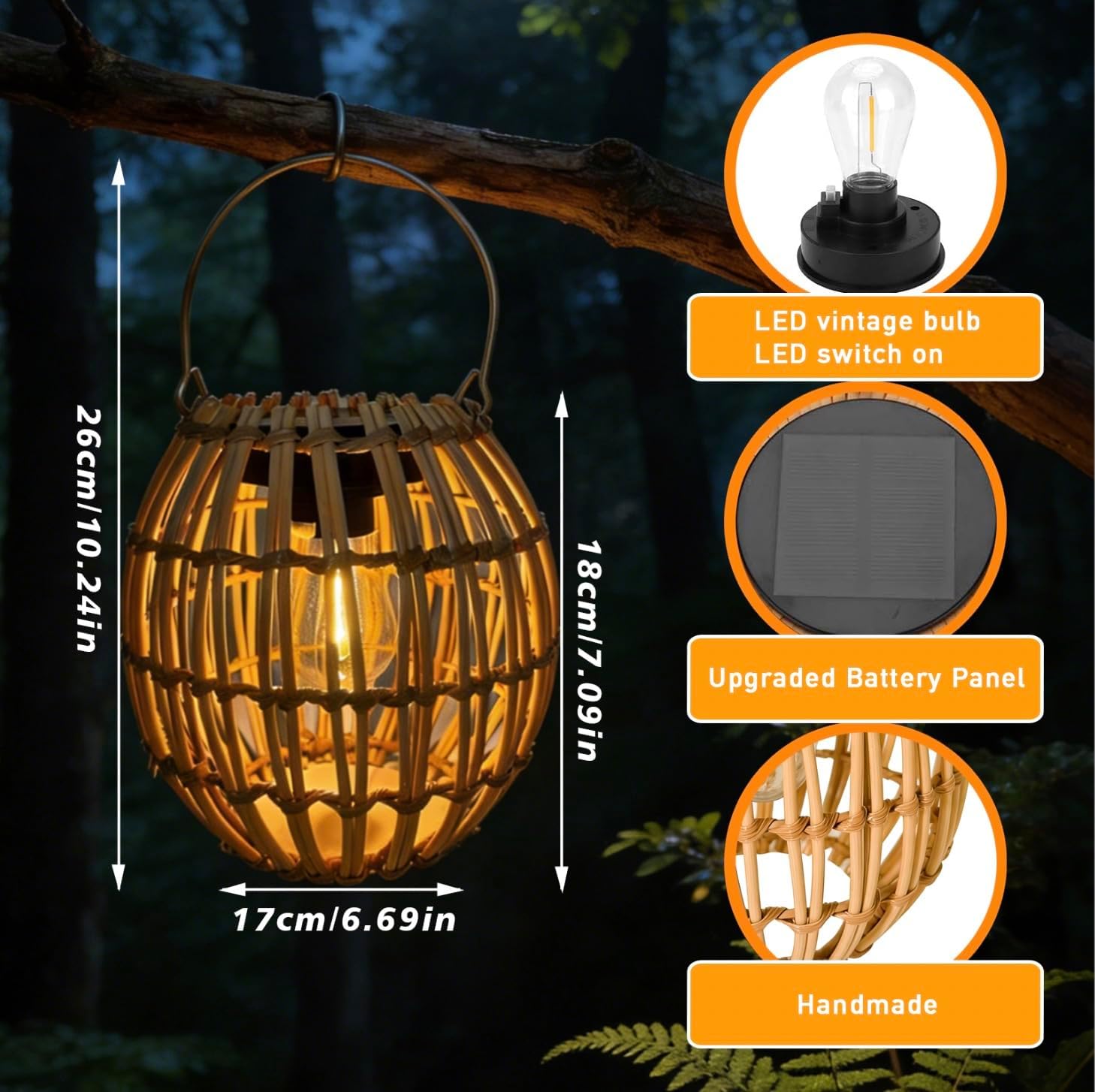 This brand-new outdoor solar lantern from Zarmanuae features exquisite craftsmanship with hand-woven details and a stylish, elegant design that adds a wonderful ambiance to your outdoor space. Even when unlit during the day, this vintage-style rattan lantern—with its irregularly spaced, hand-woven rattan—serves as a beautiful decorative piece that exudes the charm of Art Deco style. Please keep away from open flames or high-temperature areas. The rattan lantern uses a warm yellow bulb as its light source. It is powered by solar energy, requiring no wiring, making it convenient to use, energy-efficient, and eco-friendly. Equipped with a sturdy handle, it can be placed on the ground or hung in any location. Simply turn on the switch and place it in the sun to charge; it takes 6–8 hours to charge and provides 8–10 hours of illumination. Please ensure it receives ample sunlight.