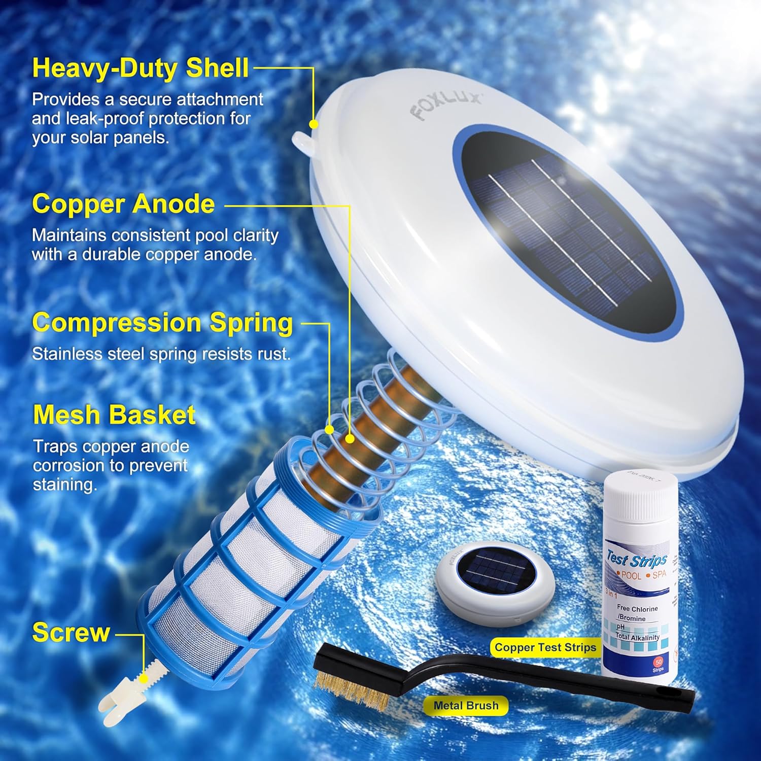 Solar Pool Ionizer with Copper Ionization & LED RGB Floating Light – Solar-Powered Pool Cleaner for Crystal Clear Water, Up to 45,000 Gallons, for Fresh & Salt Water Pools & Spas