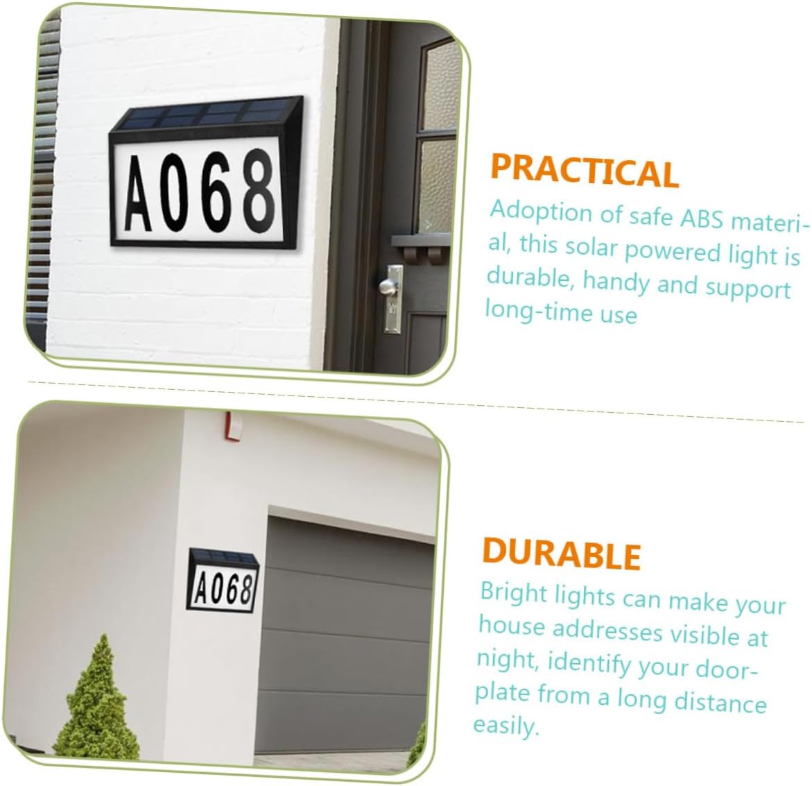 Package List 1 x lamp 26 x letters 30 x numbers 2 x screws 2 x screw expansions Features - Voltage: 2 (V) door number solar light - Charging time: About 4-6h address sign. -Product Info:Outdoor door number - Size: 28.00X18.30X3.20cm/ 11.00X7.19X1.26inch outdoor address sign light. - Battery Capacity: 1200mAh address numbers for home. - Color temperature: 6000K address sign numbers. - Battery Voltage: - 1.2V AA solar address sign lamp. - Light time: About house address numbers light. - Color: black house number solar light. - Protection level: IP65 solar light for outside. - Power control: light control doorplate light. - Solar panel: 2V/300mA address sign solar light. - Material: ABS, number sign solar light. - This solar lamp is the perfect choice to illuminate your house number after dark solar powered address sign. - Resistance to harsh weather, your friends and can find your address more clearly and quickly houses numbers solar light. - Made from ABS material for reliable and durable use, this solar address lamp is number solar lamp. - Charging during the day, and light up at night, no need of other operations, can be widely used for many outdoor places solar doorplate lamp.Goods Descriptionhome number solar lamp Solar charging, energy saving, practical and convenient, charging during the day, and light up at night.house number solar is made from ABS material for reliable and durable use.address sign solar light Simple structure, with numbers and letters, the solar light is easy to use and install, can bring you of convenience
