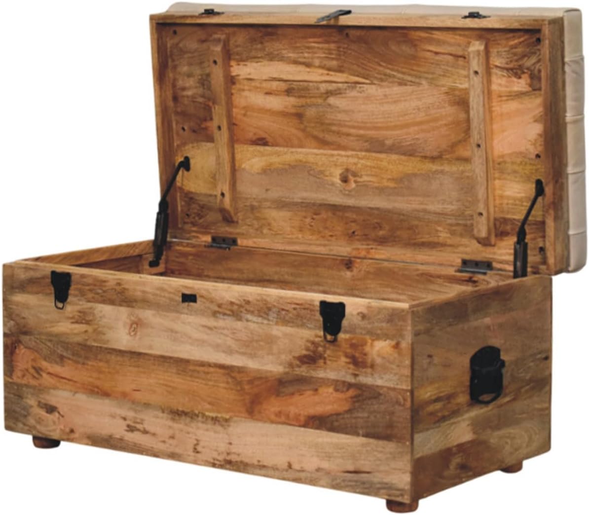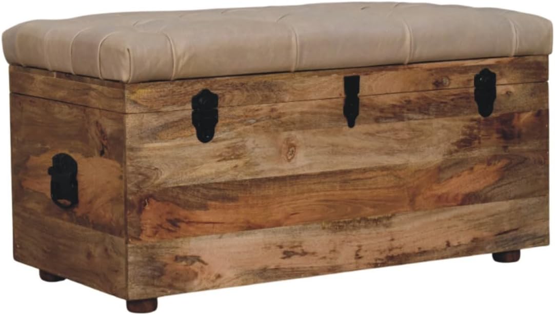 Solid Wood Hide Leather Upholstered Storage Trunk, Beige and Brown