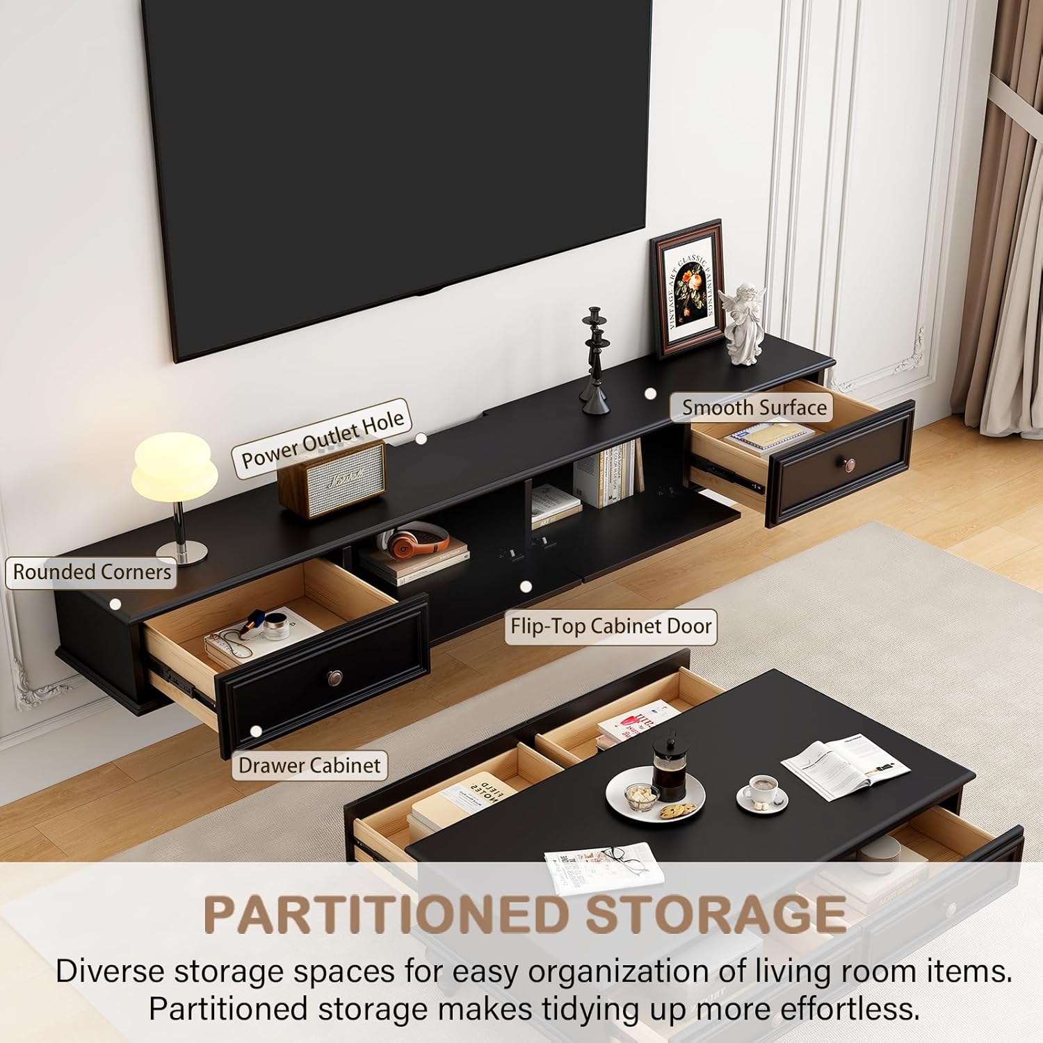 Ribanedy Modern Floating TV Unit Transform your living space with the Ribanedy Modern Floating TV Unit, a sophisticated blend of style and practicality. This sleek wall-mounted console is crafted from premium solid wood composite board, offering a smooth, fade-resistant surface and a durable build that stands the test of time. The modern design maximizes upper wall space, creating a streamlined look while freeing up valuable floor area. With its innovative cable management system, including discreet dual openings at the top and bottom, the Ribanedy TV unit ensures your entertainment area remains neat and organized. The rounded corners not only add a touch of elegance but also provide safety for family members, making it a perfect fit for any home. Installation is straightforward with the included hardware and instructions, designed for solid wood, wood, or gypsum walls. Enjoy a clutter-free, stylish media setup with ease, and elevate your living room or office with the Ribanedy Modern Floating TV Unit. Size: 55.1 x 9.4 x 7.8 in62.9 x 9.4 x 7.8 in 62.9 x 9.4 x 7.8 in 78.7 x 9.4 x 7.8 in 86.6 x 9.4 x 7.8 in 94.4 x 9.4 x 7.8 in [Size Description] Product dimensions are measured by hand, there may be slight deviations, the actual size is decisive. [Photo Caption] The product is taken in kind, and color differences may be caused by different lighting conditions, angles, screens, etc. We appreciate your understanding. [Sales Information] This shop sells only the Floating TV Console. Other items shown in pictures are not included.