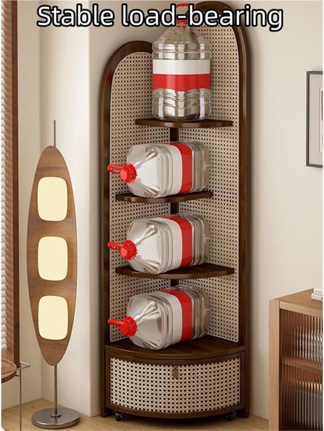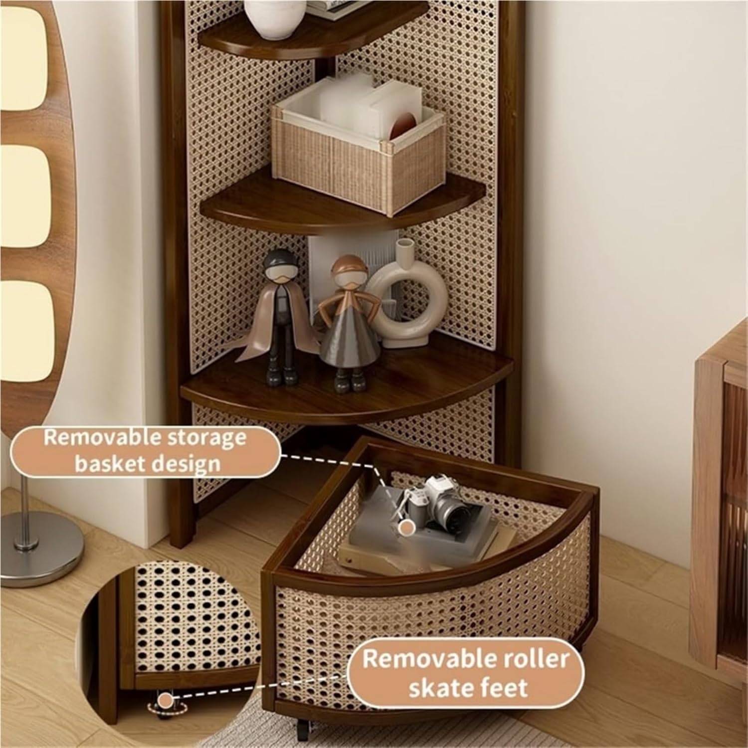 Maximize your space with our stylish rattan corner shelf, perfect for turning unused corners into functional storage solutions. This corner shelf is designed with an ergonomic triangle shape, ensuring it fits seamlessly into tight spaces while enhancing the aesthetic of any room with its handwoven rattan panels that add warmth and texture.The removable bottom basket is ideal for flexible storage of heavier items such as blankets or magazines—simply lift, fill, and slide back into place with ease. The four open shelves are perfect for keeping daily essentials, books, or decorative plants organized and easily accessible, making it a practical addition to your home.Crafted with thick panels and premium solid wood, this corner shelf provides excellent load-bearing strength, ensuring durability. It also features a removable safety barrier to protect your displayed items, offering peace of mind while showcasing your favorite décor.Installation is a breeze with our simple setup, allowing you to enjoy both the practical and decorative benefits of this versatile piece in no time.Note: 1. Color variations may occur during the shooting process; please refer to the actual product for specific colors. 2. Due to handmade craftsmanship and measurement methods, sizes may vary by 1-3CM; the actual item received will determine the specific size.