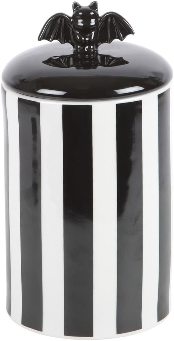 Material: Ceramic. Height: 8.07in. Width: 4.21in. Food Safe. Design: Bat, Striped. Please Note: Do Not Microwave. Depth: 4.21in. Packaging: Attached Sticker, Boxed, Cardboard. Removable Lid.