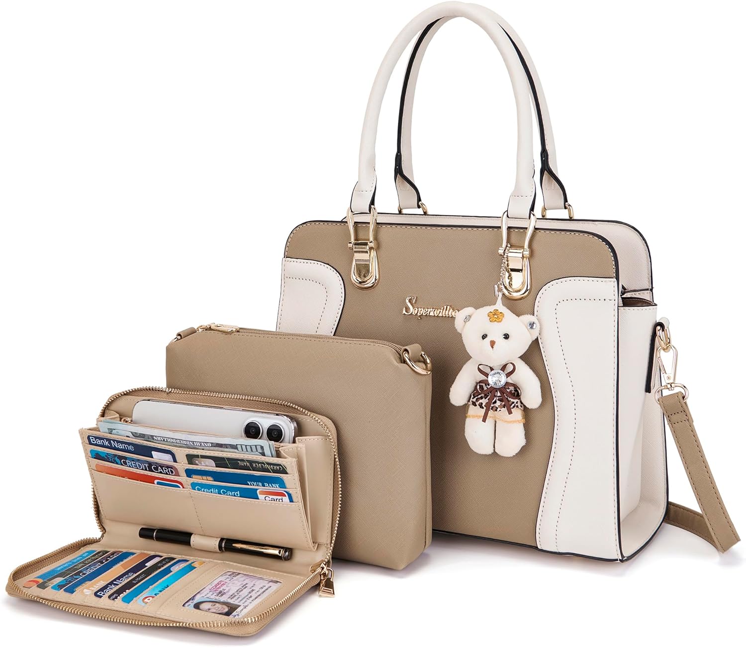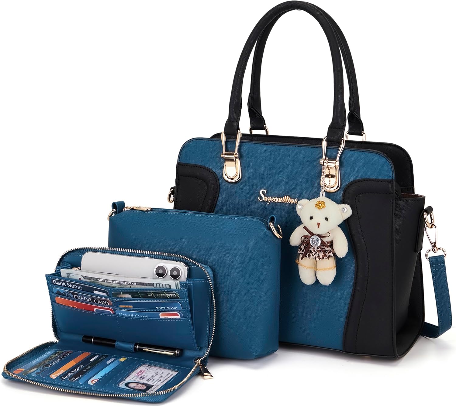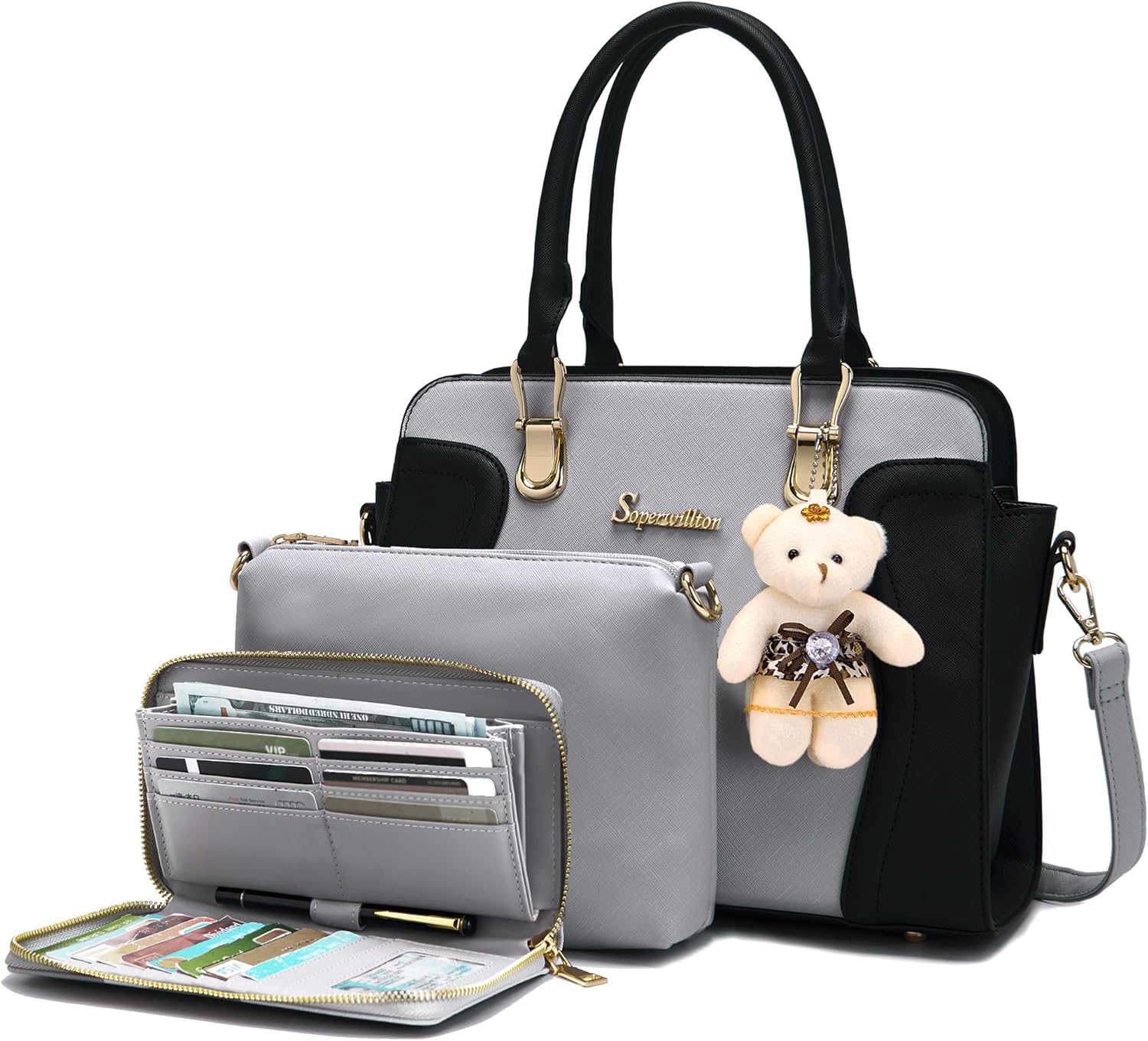 Tote bag with wallet 3pcs purse set 11 colors to choose -You can use them together or individually. Suitable for use in everyday. -Easy to match clothes in different occasions. -Varieties and beautiful colors are suitable for young ladies and girls. Durable Material & Sturdy Details -Elegent design and well stitching -Gold brand logo and delicate bear doll decoration looks more fashion Simple, Classic and Stylish -Simple stylish, Fashionable and convenient. -The handbag set is a nice gift for your family or friends. Large Capacity & Multiple Uses -Presented nicely, are all the features of this fashionable bags set. -It has plenty of organized storage and it is a chic way to keep all your essentials. -Easily carry your mobile phone, wallet, cosmetic, IPAD, umbrella and other daily things. Notes: 1. Little smell is normal, putting it outside for few days, the smell will disappear. 2. Please confirm the size according to our description instead of the product image. 3. The size may be about 1 Inch measure error due to hand measure. 4. Please allow little color difference due to different monitor or light environment.