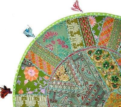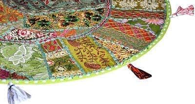 These are authentic styles Beautiful cushion studded with Heavy Embroidery, In this cover Vintage patches from old, valuable wedding saris & dresses are patched and stitched together at random to create a collage like effect and decorated with all kinds of colored , threads, patchwork, raised colored thread work and embroidery in intricate designs with beautiful tassel work. These are beautiful handmade cushion/pillow cover with rich embroidery and exotic jewel colors. Beautiful "Khambadiya" floor pillow made by hand by artisans in Barmer, India from carefully chosen and sown together patches from vintage saris, lenghas and wedding dresses. Witness the exquisite embroidery and thread work on a vibrant cotton backing, creating a stunning collage bursting with gorgeous patterns and colors! 17 by 17 inches , Beautiful aari tari work and embroidery