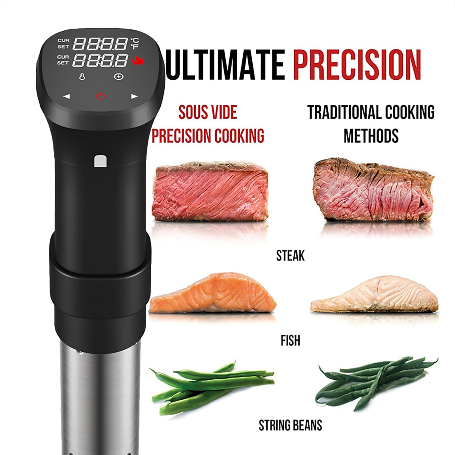 Recipes Advice: Steak-132°F/55.5°C, 6 Hours Salmon-110°F/43°C, 30-45 Minutes Chicken-140°F/60°C, 30 Minutes Eggs-140°F/60°C, 10 Minutes Product Information: Product Name:Sous Vide Machine Temperature Min: Room Temperature Temperature Max: 99 ºC Temperature Stability: ± 0.01ºC Power: 1800W Circulation Pump: 11L Max Product Size:38cm *29cm*25cm Product List: 1*Sous Vide Machine; 1*Manual