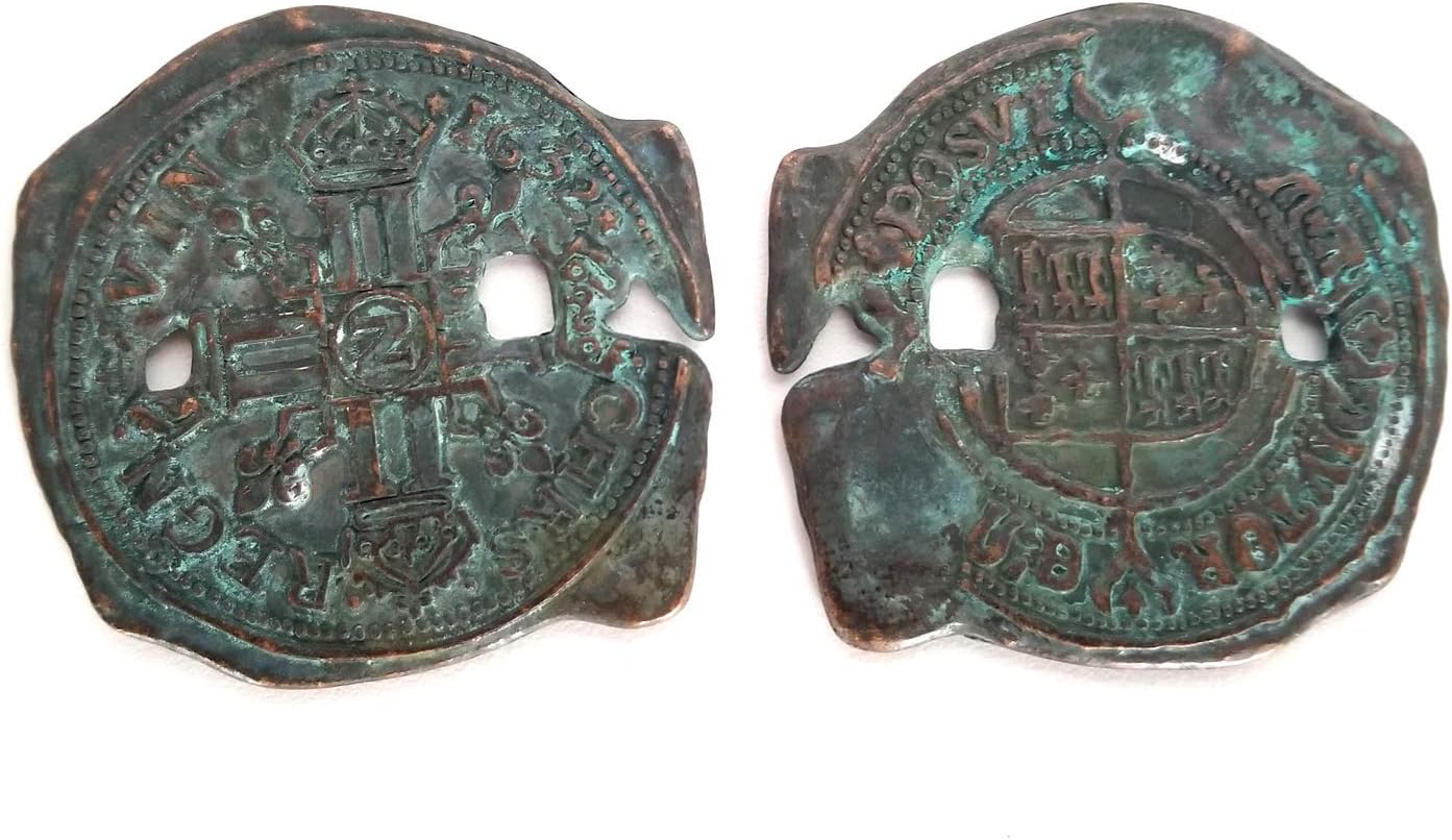 This listing is for one (1) replica Spanish doubloon. The picture with multiple replica doubloons is there to show the slight variations that can occur from coin to coin. These custom made replica Spanish Doubloons are cast in metal (zinc casting alloy), custom plated, and carefully tarnished to create the appearance of a long forgotten coin. This replica is a 1:1 scale of the original prop. Both sides of the coin are designed to be screen accurate to the original prop. This is one of the few iconic props seen in the movie. According to legend, One-Eyed Willy had his own currency cast for use amongst his men. One of his coins was marked with three small holes as a clue to help lead to his cache of hidden treasure found by a band of kids who live in the "Goon Docks" neighborhood of Astoria, Oregon. The original prop doubloon along with the treasure map they find successfully leads them to One-Eyed Willy's treasure which contains various gold coins and jewels. This replica doubloon is about 2.32 inches (59mm) in diameter and .130 inches (3.3mm) in thickness. The weight is 1.6 oz (46g).