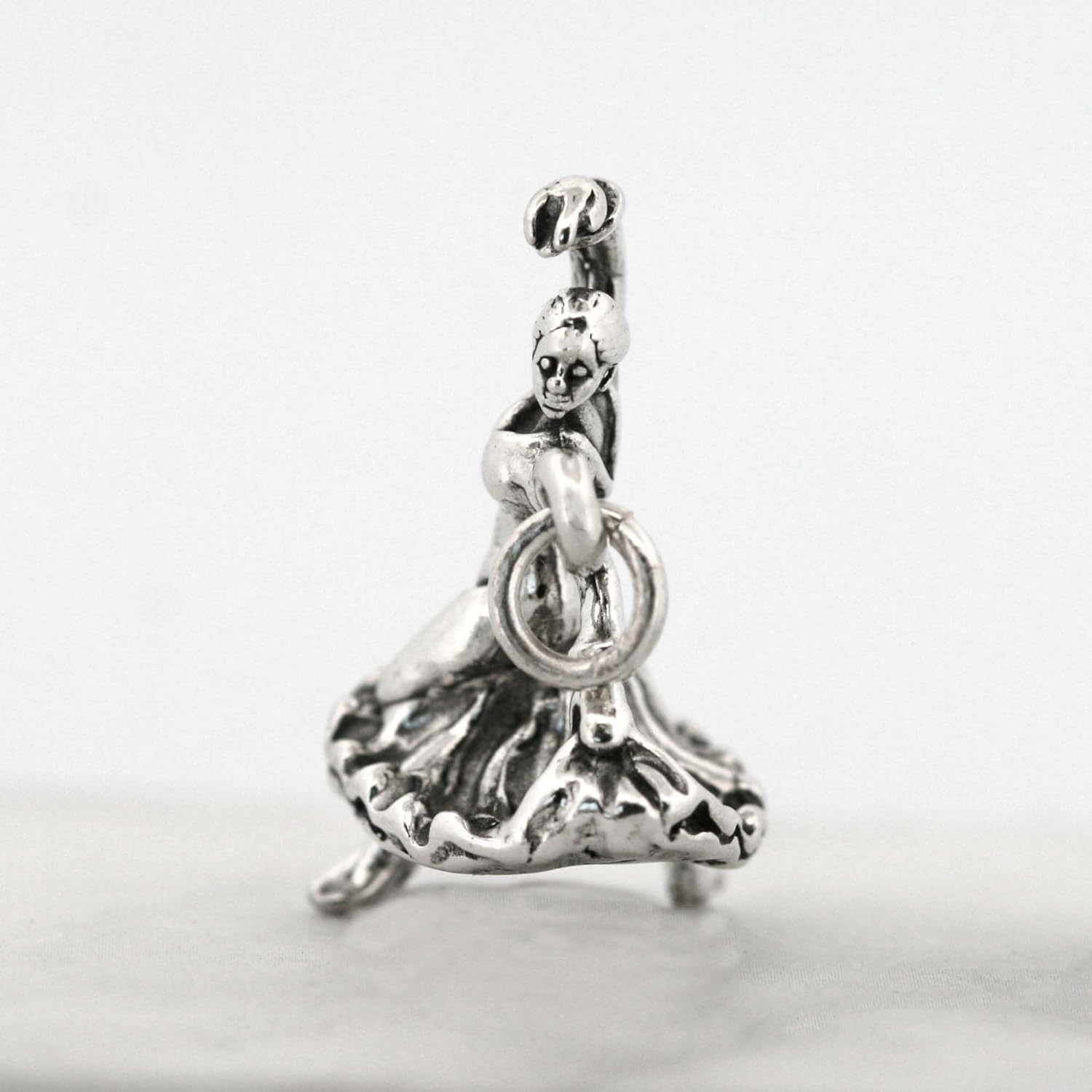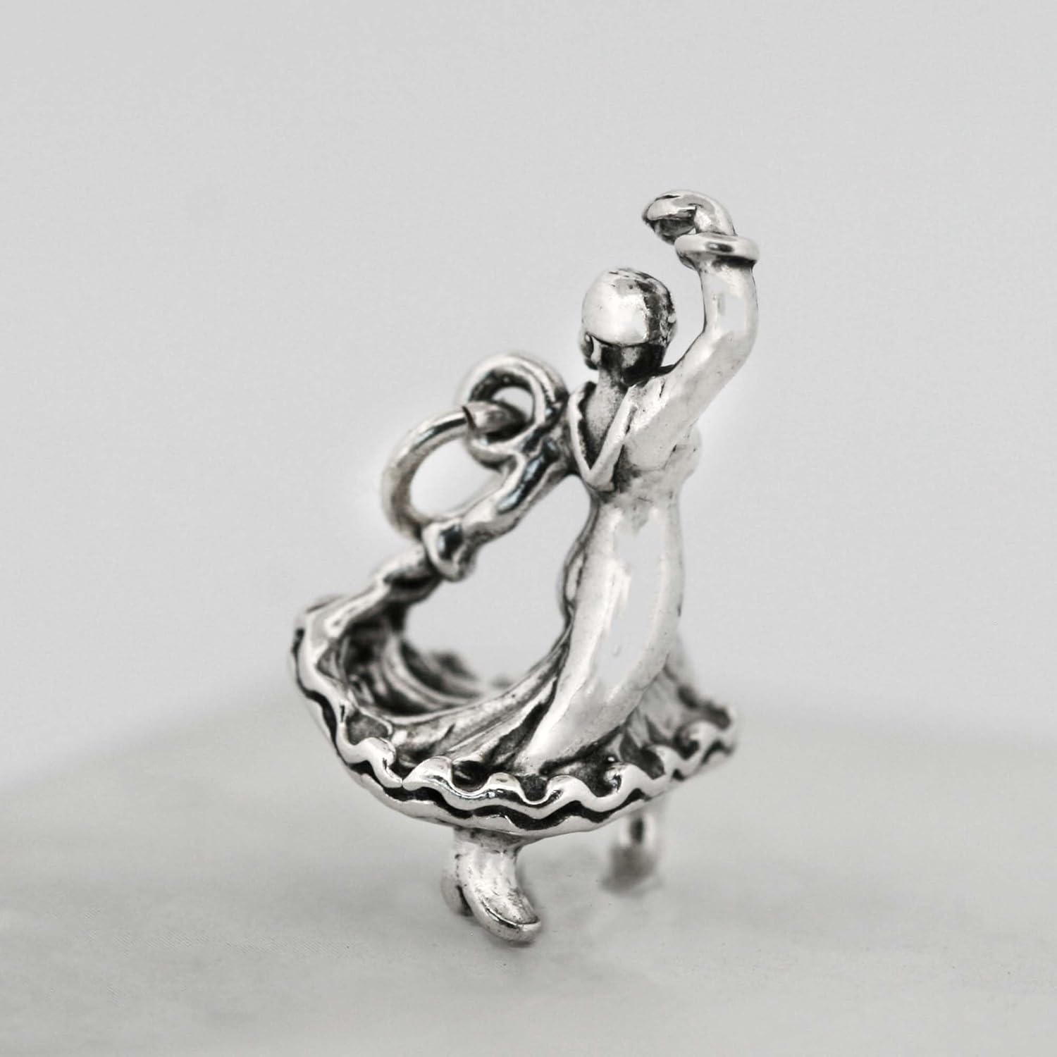 Flamenco dancer 3D .925 solid sterling silver charm or pendant. The charm is hallmarked, comes with a 6mm sterling silver keychain/split ring, and can fit a traditional charm bracelet or a chain necklace.