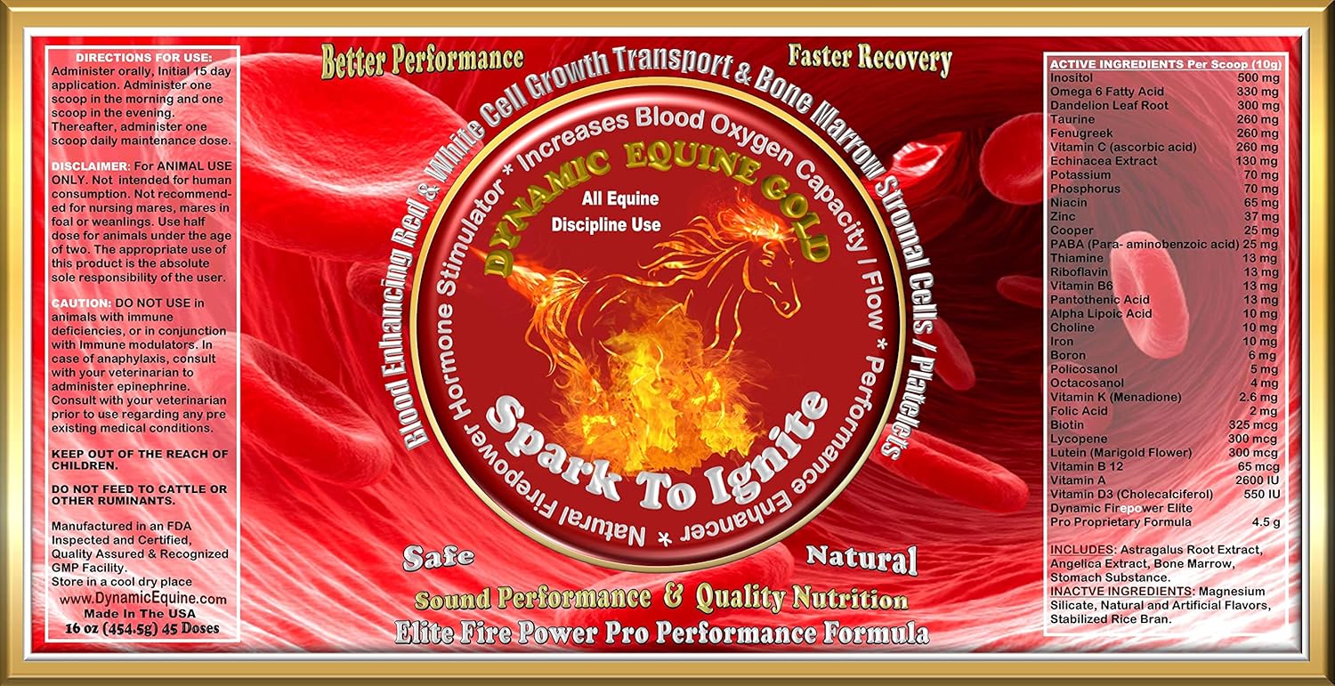 Performance Blood Enhancing Red & White Cell Growth / Oxygenation Transport & Bone Marrow Stromal Cells / Platelets. THE Horsemen's Choice For Their Racing Thoroughbred / Standardbred / Harness / Trotters and All PERFORMANCE HORSES ! Natural Kidney Firepower Hormone Stimulation Booster. Increases Red Blood Cells while Supporting White Blood Cells Safely/Effectively Thereby Transporting More Oxygen to Muscles for that SPARK TO IGNITE ! It Importantly Supports Bone Marrow Stromal Cells/Platelets. SPARK TO IGNITE is an all natural product, which can safely stimulate the horses natural occurring hormone production of red blood cells that is produced primarily in the kidneys. Following the production in the kidneys, the hormone flows to the bone marrow where the creation of red and white blood cells take place. In short, it increases the body's oxygen carrying capacity, which in turn produces more muscle energy. In about 30 days this product can sensibly promote Increased * Muscle Strength * Stamina * Endurance * Speed * Energy * Immune System Support * Faster Recovery Between Performances * Natural and Continual Cell Revitalization * Significant Overall Enhanced IGNITED Performance. SPARK TO IGNITE...Elite Fire Pro Performance Enhancer Edition, Builds Both Red and White Equine Blood Cells to Maintain System Safety and Stability. All Natural Firepower Kidney Hormone Stimulation Booster. It increases Red Blood Cells while Supporting White Blood Cells Safely and Effectively, Thereby Transporting More Oxygen to the Muscles for that ENHANCED...SPARK TO IGNITE...PERFORMANCE. It also Importantly Supports Bone Marrow Stromal Cells / Platelets. FOR HORSES OF ALL EQUINE DISCIPLINES ! Also contains BONE MARROW and STOMACH SUBSTANCES. BETTER...STRONGER...FASTER ! This “DYNAMIC EQUINE PROPRIETARY SPECIALTY MATRIX FORMULA” is made up of the finest vitamins, minerals, herbs and nutrients.