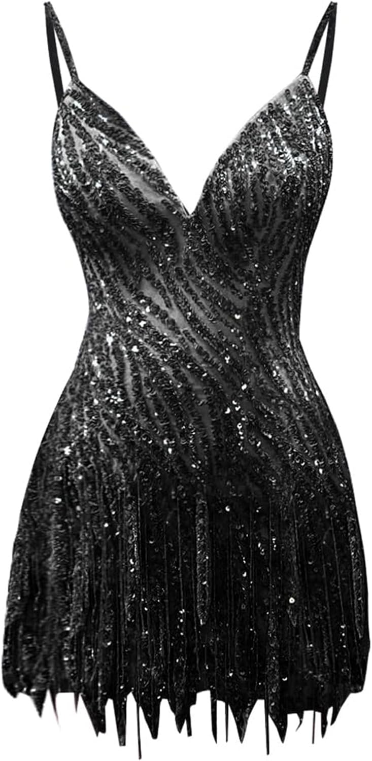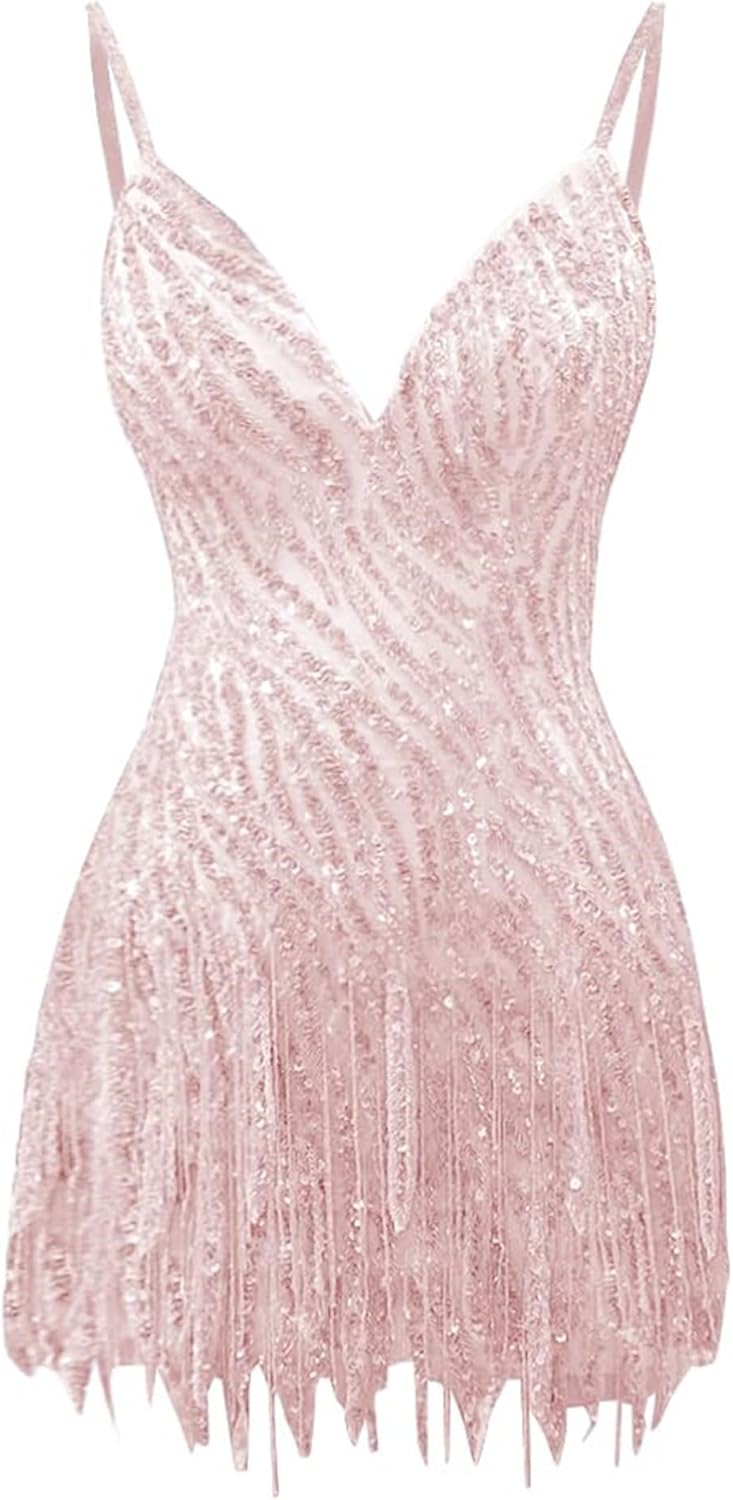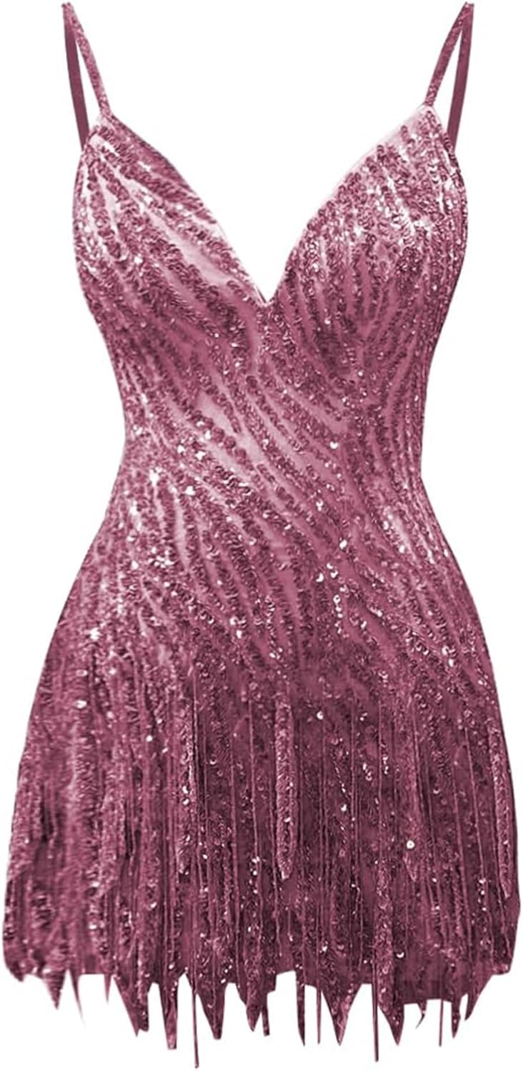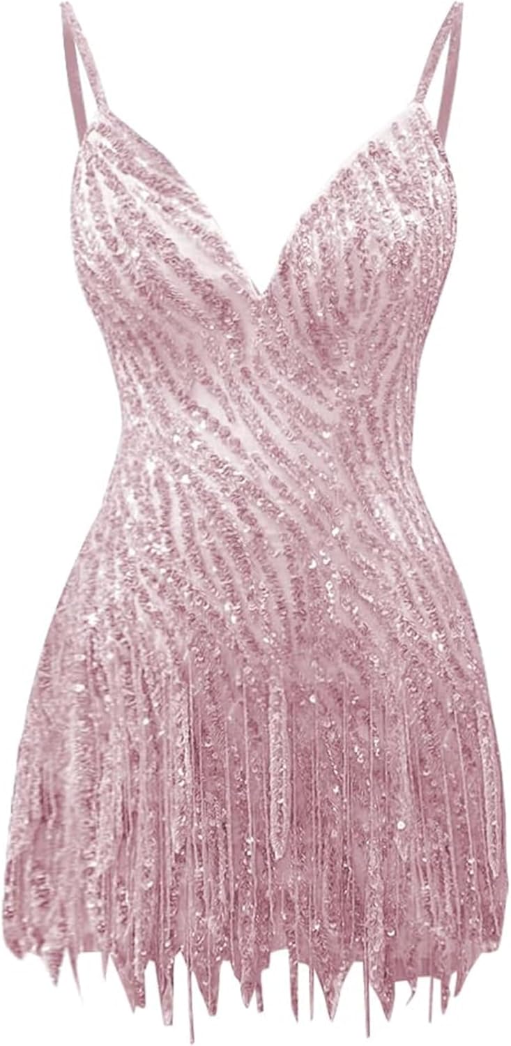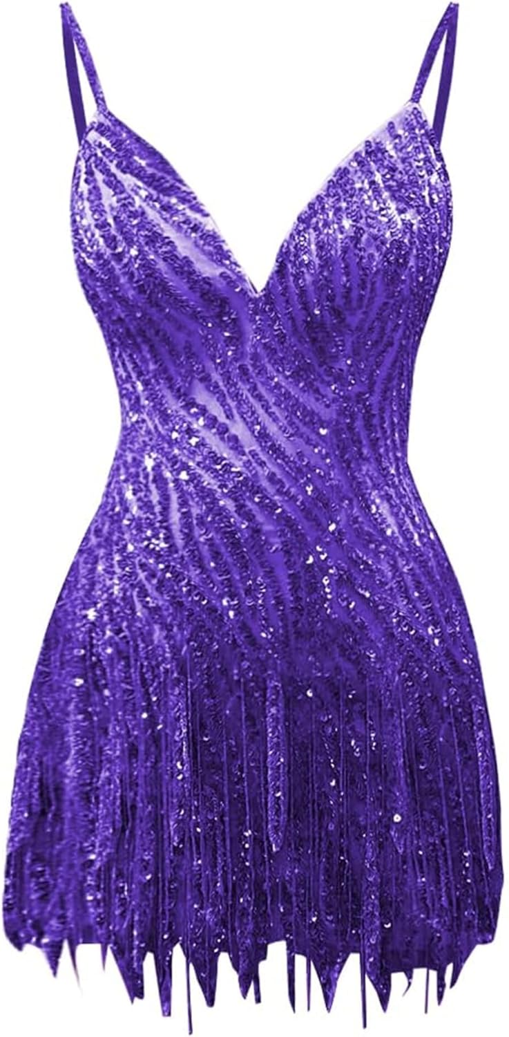 Make a dazzling entrance in this stunning sequined party dress that commands attention. The short-length design features an alluring V-neckline and delicate spaghetti straps that create an elegant silhouette. each dress is adorned with intricate sequin detailing that catches and reflects light with every movement. The showstopping fringe hem adds a playful, dynamic element perfect for dancing the night away. The fitted bodice transitions beautifully into the fringe detail, creating a flattering shape that celebrates feminine curves. This dress is ideal for special occasions, from cocktail parties to homecoming celebrations. The open back design adds an extra touch of allure, while the quality construction ensures the dress maintains its shape throughout the evening. The sequin pattern creates a cascading effect that draws the eye downward to the statement-making fringe hem. Pair with strappy heels and minimal jewelry to let this show-stopping dress take center stage.