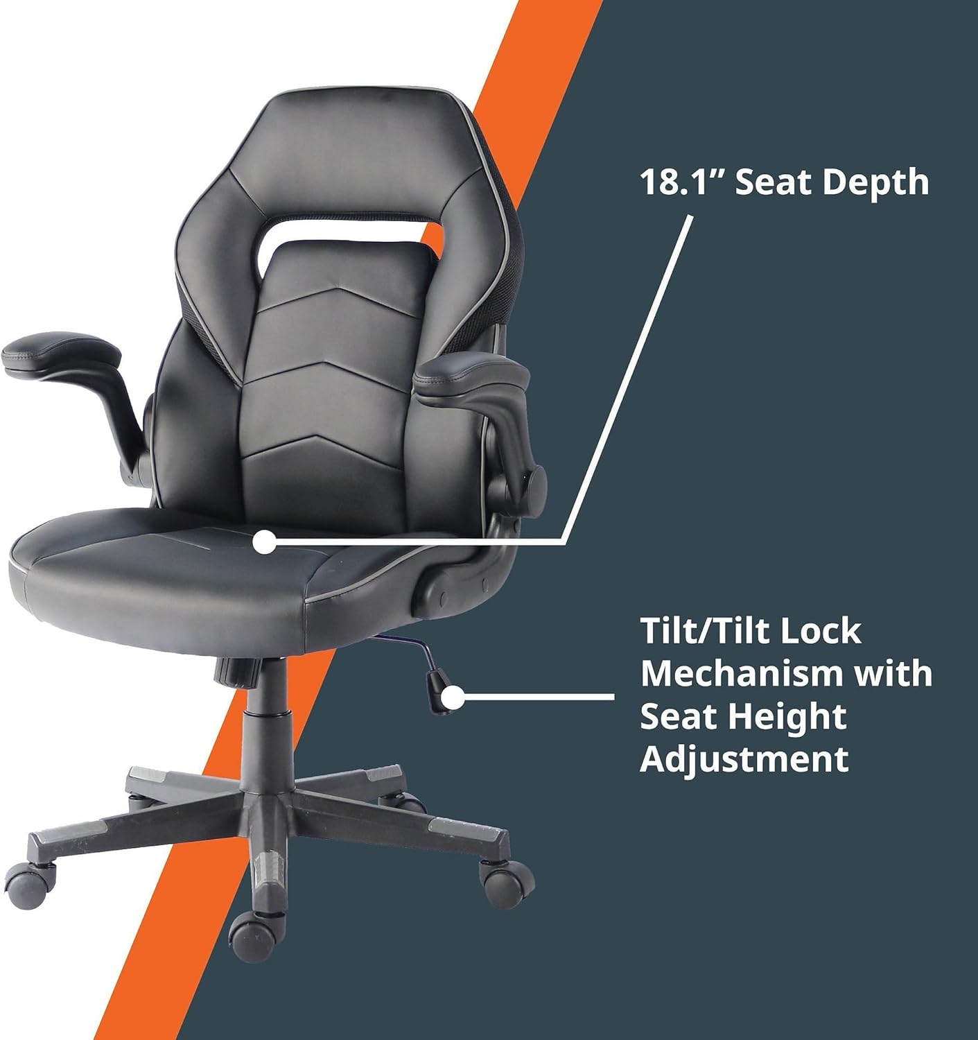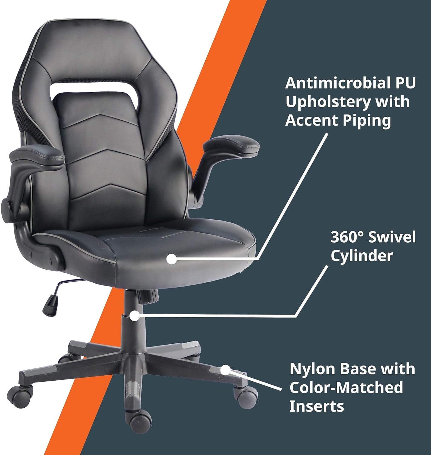 SpawnSafe Gaming Chair with Antimicrobial Upholstery thoughtfully combines personalized, ergonomic comfort with tasteful style for the ultimate desk chair. Antimicrobial PU upholstery allows easy cleaning and comes with accent piping for added style and a pop of color. Upholstered and padded armrests offer extra comfort, or can be flipped up out of your way. Easily personalize the comfort level of your chair with the Tilt Tension and Seat-Height adjustment features. Lock your personal tilt and seat-height settings into place with the specialized locking mechanism. Swivel Cylinder sitting just above the chair's base allows you to swivel a full 360-degrees. Nylon base comes with color-matched inserts and moves on 2" smooth-rolling hooded casters. Seat depth measures 18.1".