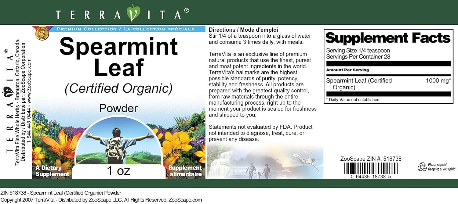 Spearmint Leaf (Certified Organic) Powder (1 oz, ZIN: 518738)Packaged in the United States in a GMP certified facility (Good Manufacturing Practice).No fillers.Manufacturer: TerraVitaSize: 1 ozConvenient Powder format.Ingredients: Spearmint Leaf (Certified Organic)