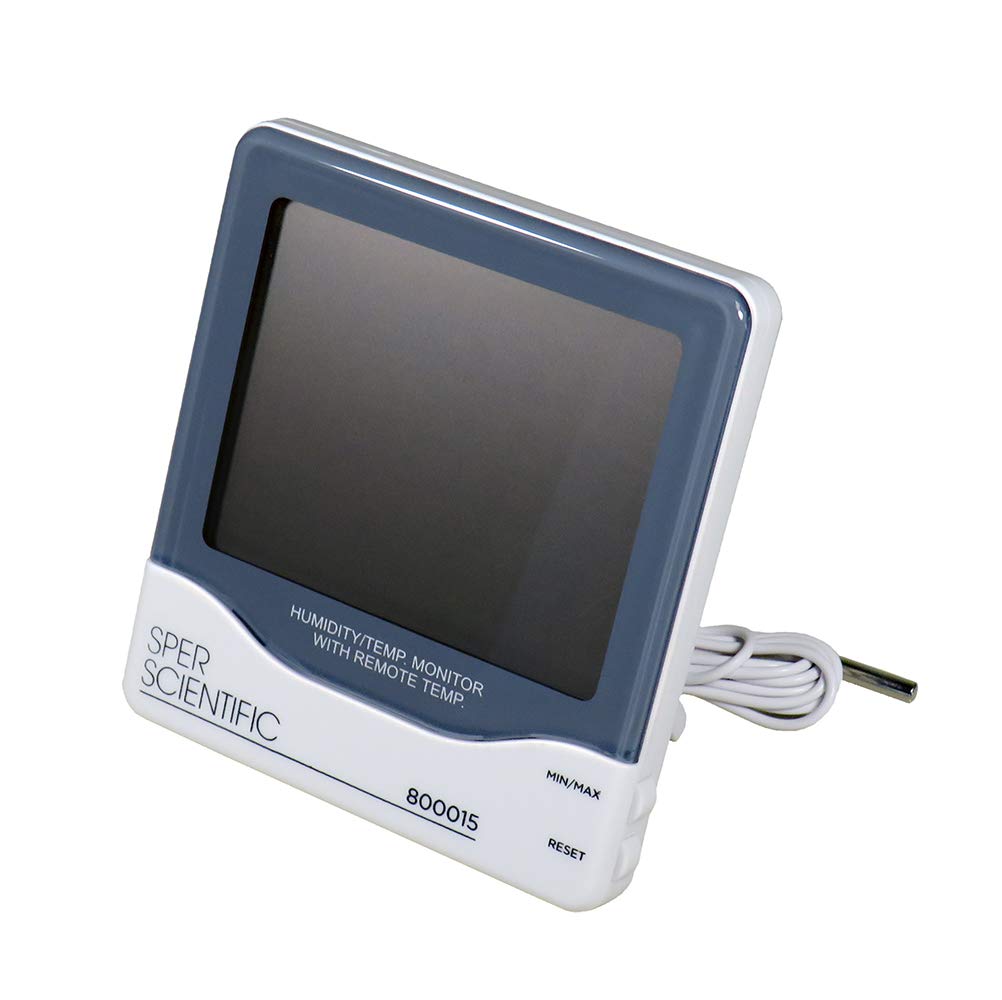 Simultaneously displays internal and external temperature on a 3 3/16" x 2½" LCD, large enough to be read across a room. Useful as an indoor/outdoor thermometer, in incubators or anywhere simultaneous internal and external readings are required. Has min/max temperature memory. Can be wall mounted or freestanding with easel back. Recall min/max readings over any time period or have it automatically reset itself every 24 hours. The outdoor sensor is mounted on a 9½' cable. Comes with 1 AAA battery which lasts a full year.