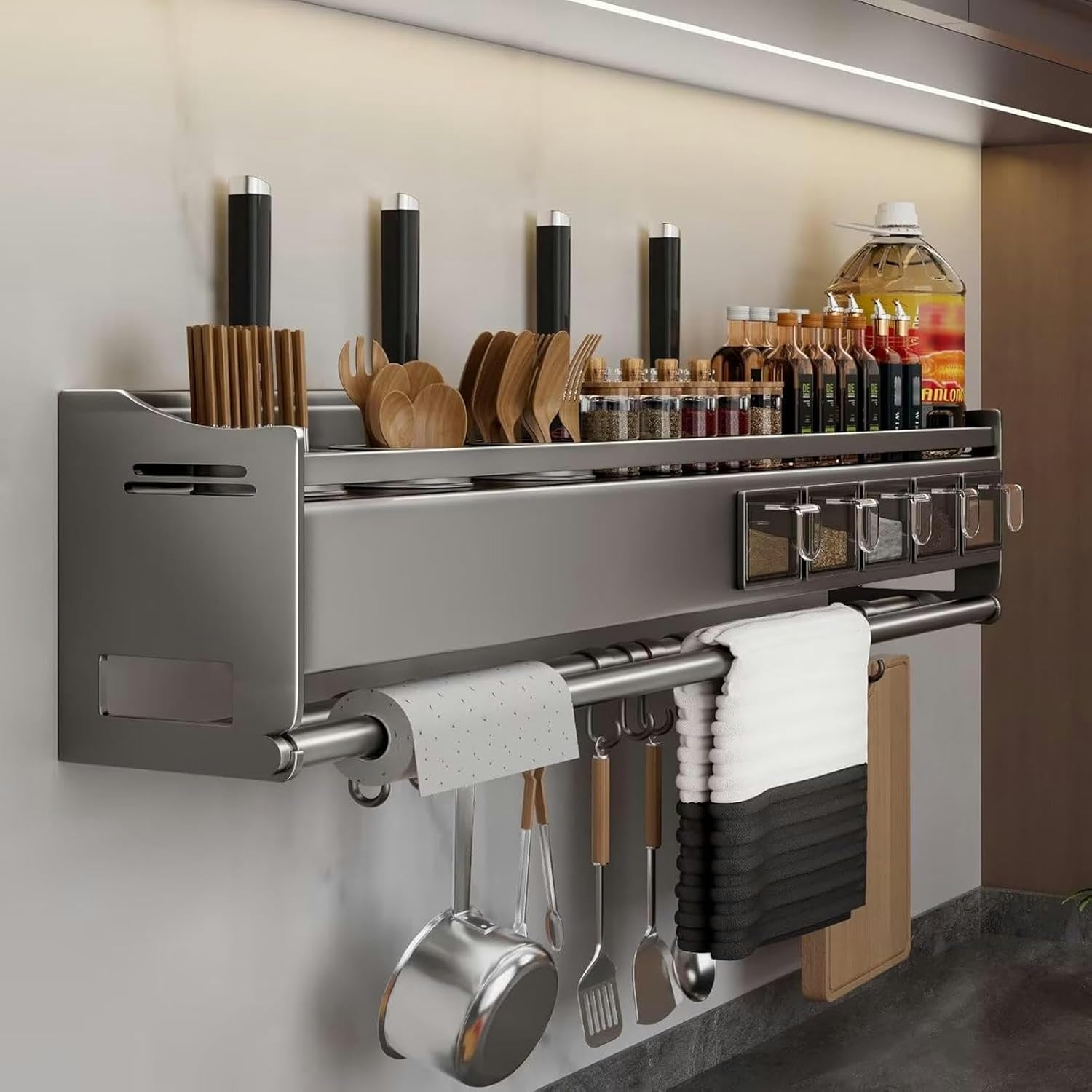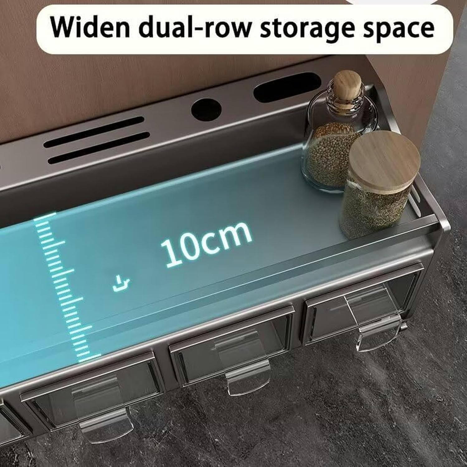 Practical Kitchen Spice Rack OrganizerSpecification:Material: carbon steelColor: grayFeatures: Sturdy, Waterproof, Rustproof, Easy to use and clean, No drilling or assembly is required, detachable design.34 x 13 x 18 cm spice rack Package Included:1 * spice rack3 * seasoning box1 * utensil holder4 * hooks1 * screws & glue 43 x 13 x 18 cm spice rack Package Included:1 * spice rack3 * seasoning box2 * utensil holder4 * hooks1 * screws & glue51 x 13 x 18 cm spice rack Package Included:1 * spice rack4 * seasoning box2 * utensil holder6 * hooks1 * screws & glue 59 x 13 x 18 cm spice rack Package Included:1 * spice rack5 * seasoning box2 * utensil holder8 * hooks1 * screws & glue 68 x 13 x 18 cm spice rack Package Included:1 * spice rack5 * seasoning box3 * utensil holder8 * hooks1 * screws & glue