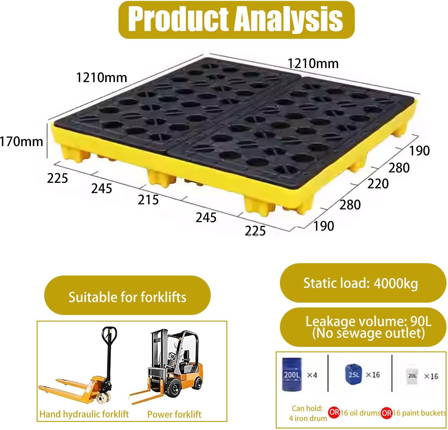 The seamless construction of this spill containment pallet eliminates leaks to protect against unwanted spills and help avoid potential fines while the removable top grate makes cleaning easy.Suitable for various industrial parks, warehouses, aquaculture water storage, and more.▶PRODUCT DETAILSName: Modular Spill Platform/Plastic TrayMaterial: polyethyleneProduct size: Length x Width x ThicknessColor: Yellow+Black(colors are eye catching and not easy to fade)Size: We have 18 sizes for you to choose, please select the size you needFeatures: waterproof, wear-resistant, cold-resistant, strong load-bearingAdditional features: Removable, Flip, Liftable, Storage, Push-Pull, HydraulicLoad capacity: Each size of pallet has a different load capacity, the larger the size the greater the load capacity.▶PACKAGE CONTENTSSpill Containment Platform x 1