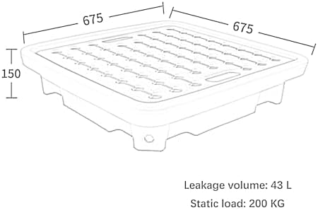 Introducing our premium Spill Containment Pallet, designed to provide robust protection and safety for your workspace. With its reinforced rib structure, this pallet ensures exceptional impact resistance and enhanced load-bearing capacity, making it a reliable choice for various industrial applications. The anti-slip textured surface significantly increases friction between the pallet and your goods, reducing the risk of accidental slips and spills. When leaks occur, our innovative design channels all liquids directly into the tray's penetration area, preventing environmental contamination and simplifying cleanup. Crafted from durable polyethylene, our Spill Containment Pallet is available in vibrant yellow and black, ensuring visibility and compliance in any setting. We offer multiple sizes to meet your specific needs: - Size A: 68x68x10CM, Leakage volume: 20 L, Static load: 400 KG - Size B: 67x67x10CM, Leakage volume: 30 L, Static load: 300 KG - Size C: 67.5x67.5x15CM, Leakage volume: 43 L, Static load: 200 KG - Size D: 67.5x67.5x15CM, Leakage volume: 43 L, Static load: 500 KG - Size E: 72x72x15.5CM, Leakage volume: 25 L, Static load: 500 KG, Dynamic load: 300 KG Our product features include being leakproof, non-slip, firm, ventilated, wear-resistant, and capable of handling strong loads. Whether you're dealing with chemicals, oils, or other hazardous materials, our containment pallet provides peace of mind and efficient protection for your facility. Please note that the listing is for the Spill Containment Pallet only; other items shown are for demonstration purposes. Elevate your safety standards today with our reliable and efficient Spill Containment Pallet, designed to meet the demands of your business while ensuring a cleaner and safer environment.