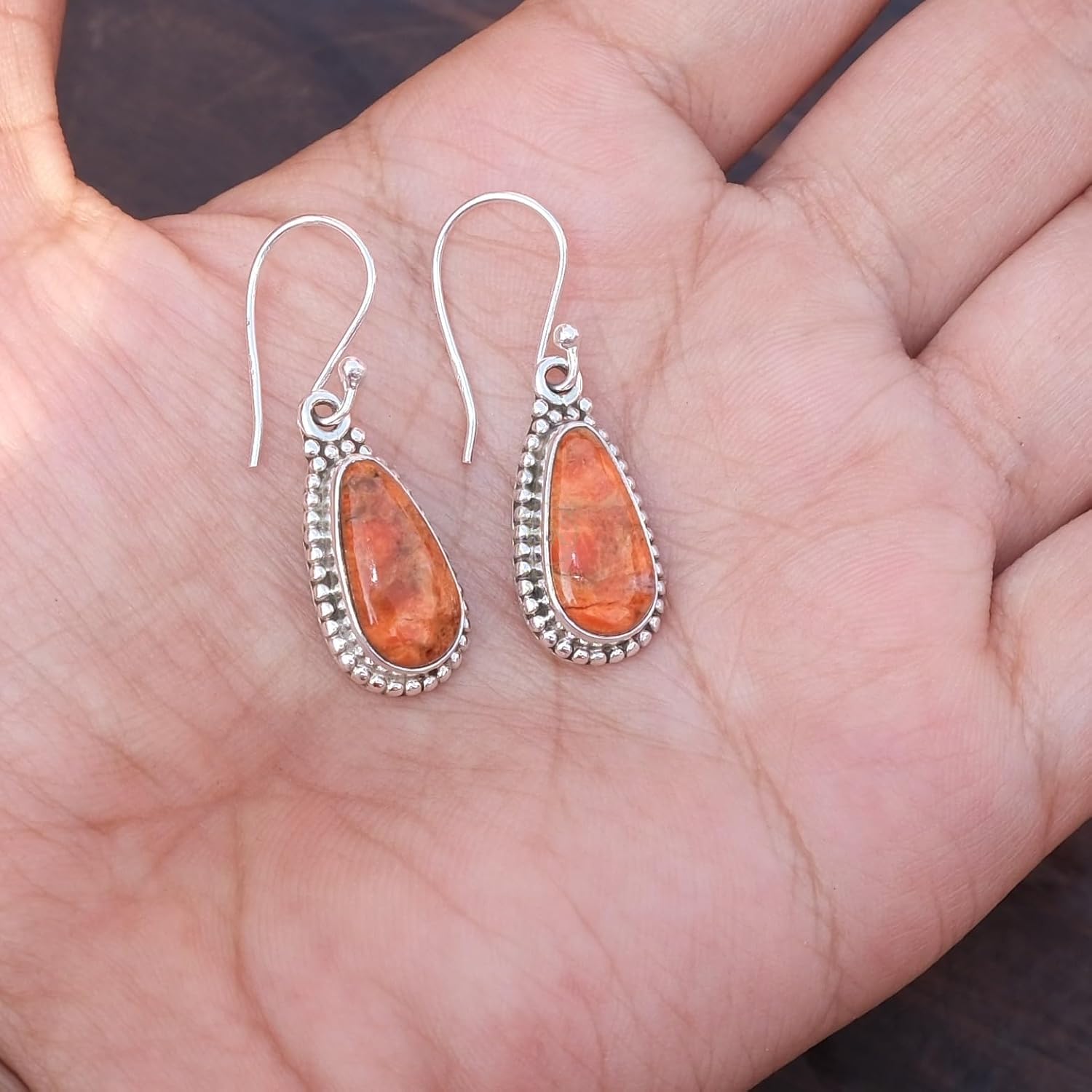 These Spiny Oyster Turquoise gemstone drop dangle earrings are handmade in 925 sterling silver, featuring warm orange spiny oyster stones accented with natural turquoise for a striking contrast. The handcrafted silver setting and flowing dangle design create gentle movement, adding an earthy yet elegant touch to any look. Inspired by traditional craftsmanship and natural materials, these earrings are suitable for both everyday wear and special occasions, making them a distinctive jewelry choice for women who appreciate handmade designs and vibrant gemstone color.》Product Details:- Product - Earrings Metal - 925 Sterling Silver Stamp - 925 Gemstone - Spiny Oyster Turquoise Gemstone Color - Orange Gemstone Treatment - No Treatment (Natural) Product Weight - 7.00 Approx 》About Product:- Our products are completely handmade and made of pure 925 sterling silver and natural gemstones, so don't worry about the product, 100% customer satisfaction guaranteed. 》Problem Resolution:- Customer satisfaction is my top priority so if you have any questions or facing any problem, please feel free to contact us anytime. We will resolve your issue within 24 hours. Thank you for visiting my shop.