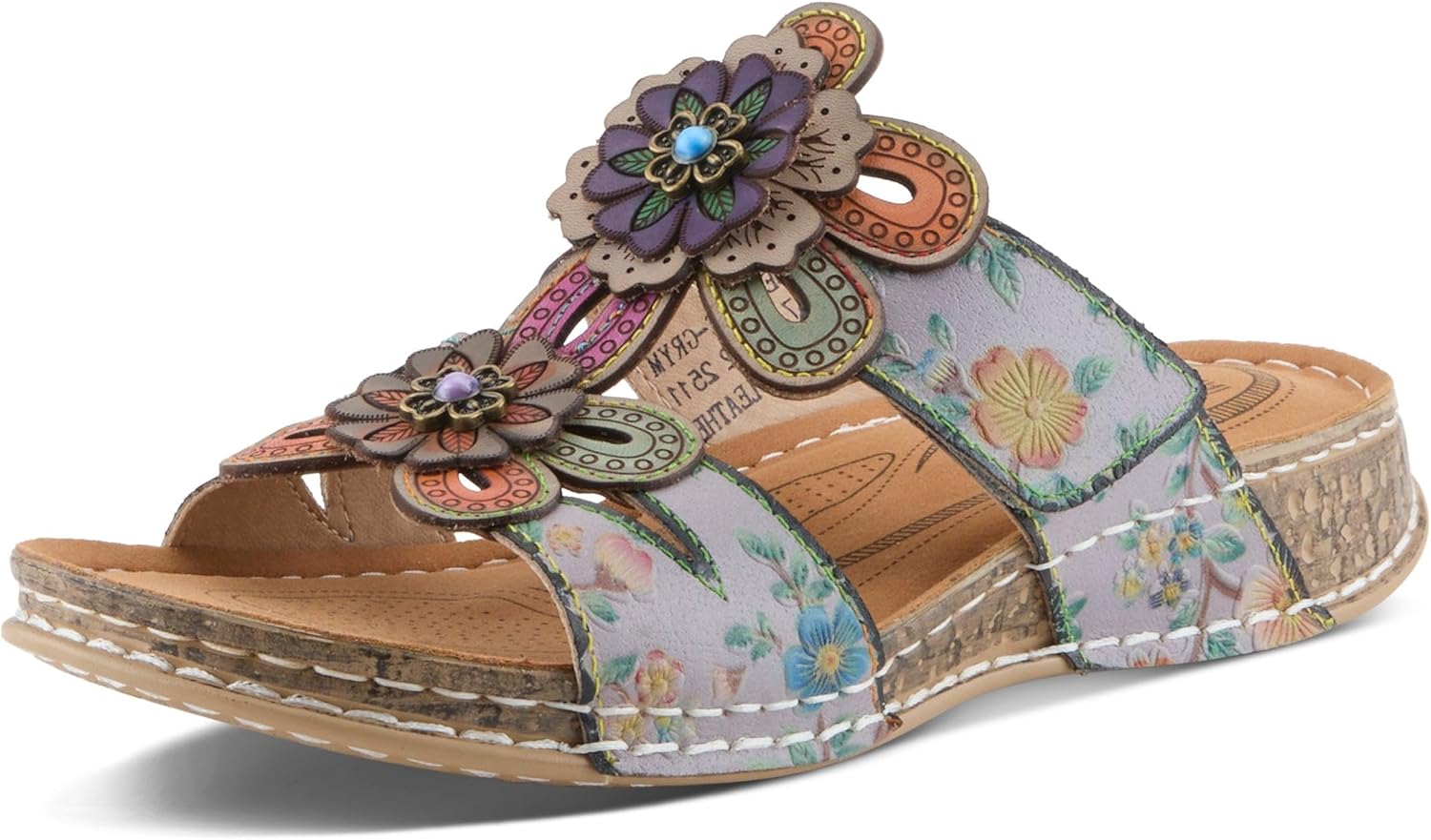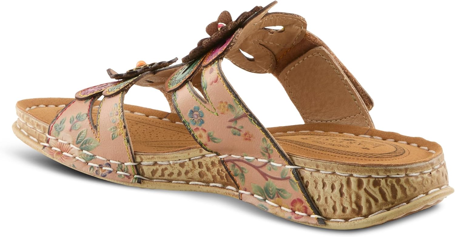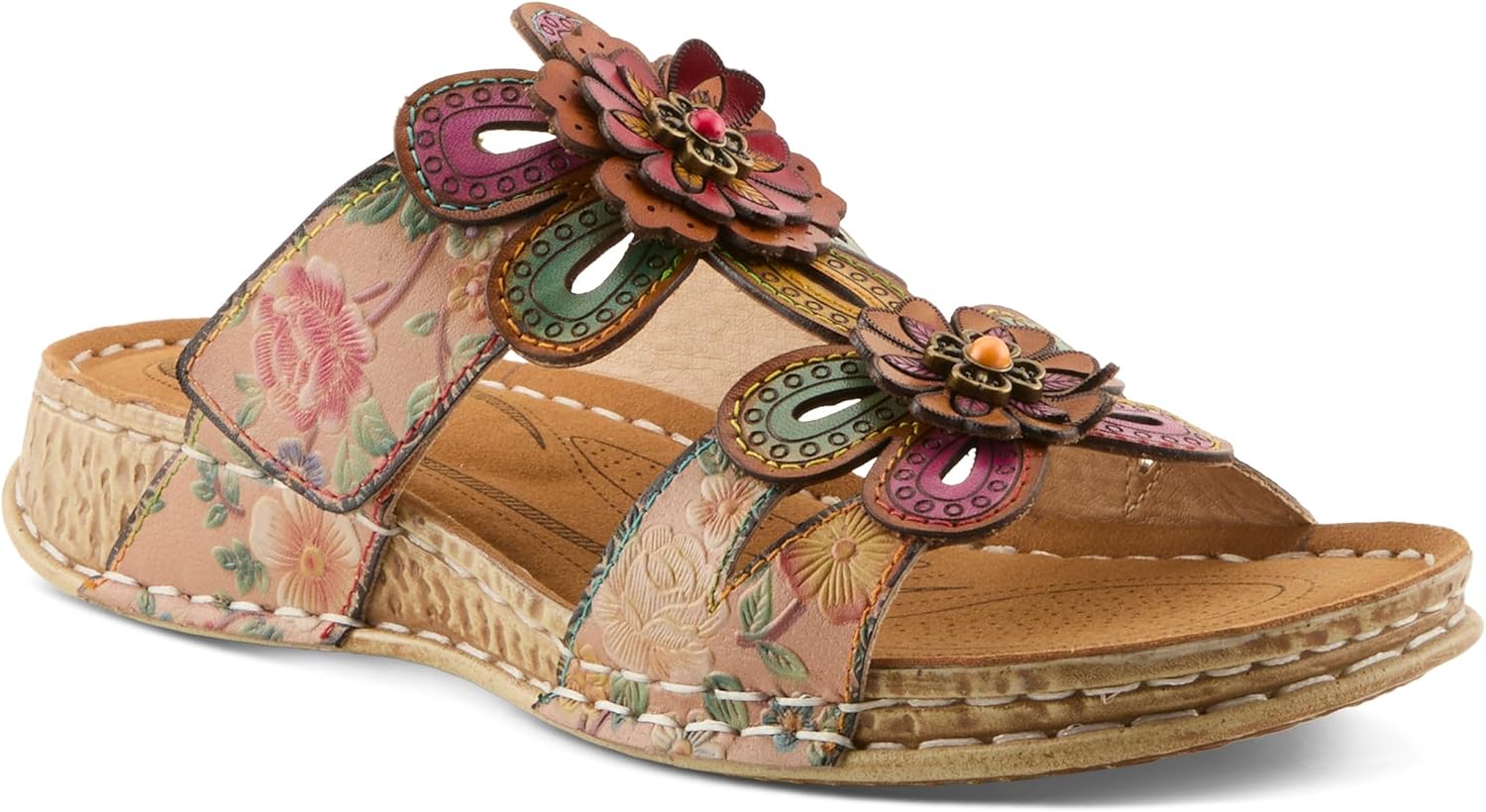 Step into timeless artistry with the L`Artiste Beaudie women's sandal, featuring a hand-painted leather upper that combines embossed floral designs with dimensional leather flowers for an exquisite look. Antique-finish hardware and rounded conchos add a subtle heritage-inspired charm to this statement piece. The sandal is crafted for day-long wearability, boasting a soft microsuede insole and a cushioned footbed that cradles your foot in comfort. The adjustable hook-and-loop closure ensures a personalized fit, making this sandal as practical as it is striking.Flexible poly outsole construction encourages natural movement, offering lightweight stability wherever your day takes you. With its balance of artisan detail and modern comfort, the L`Artiste Beaudie sandal is perfect for elevating everyday style.