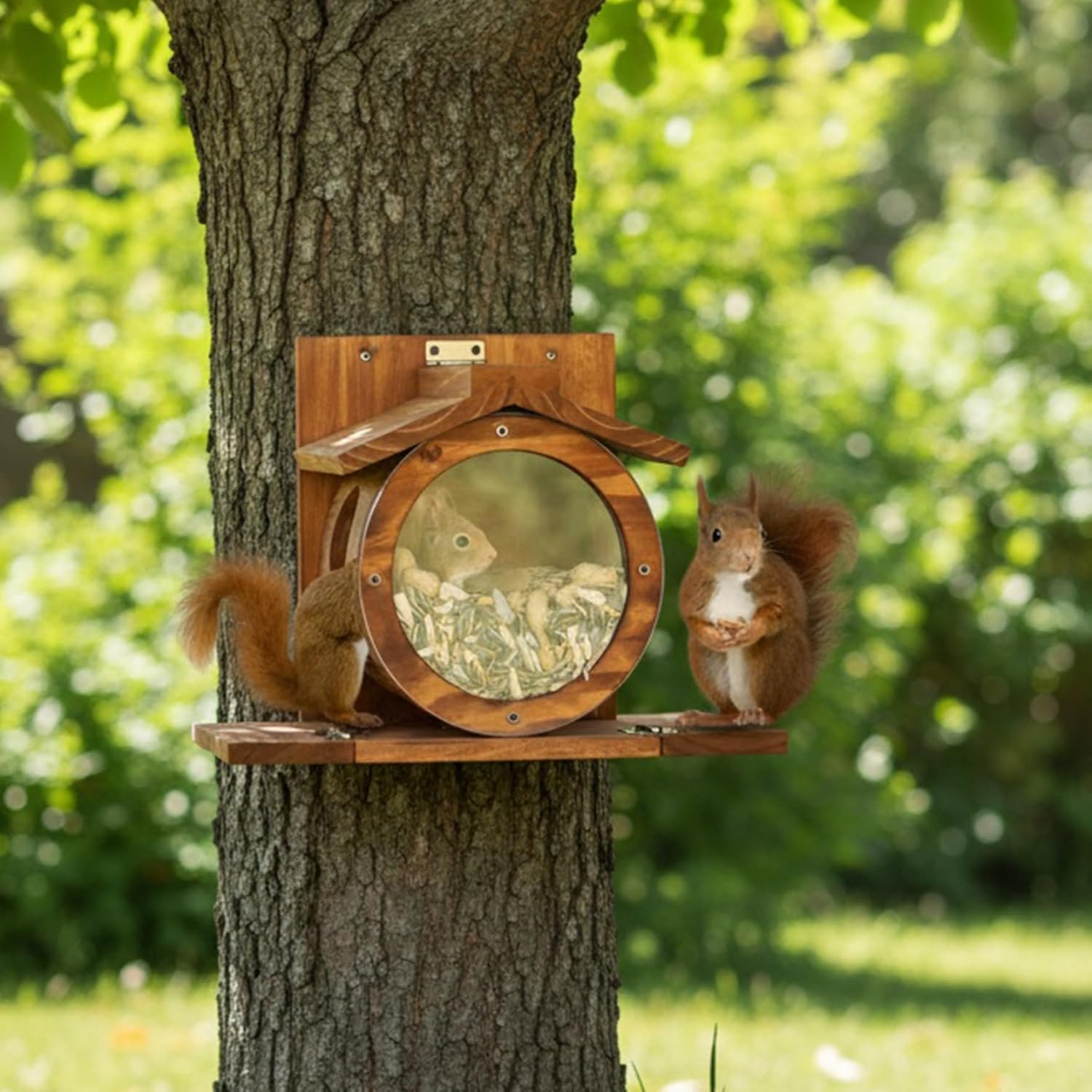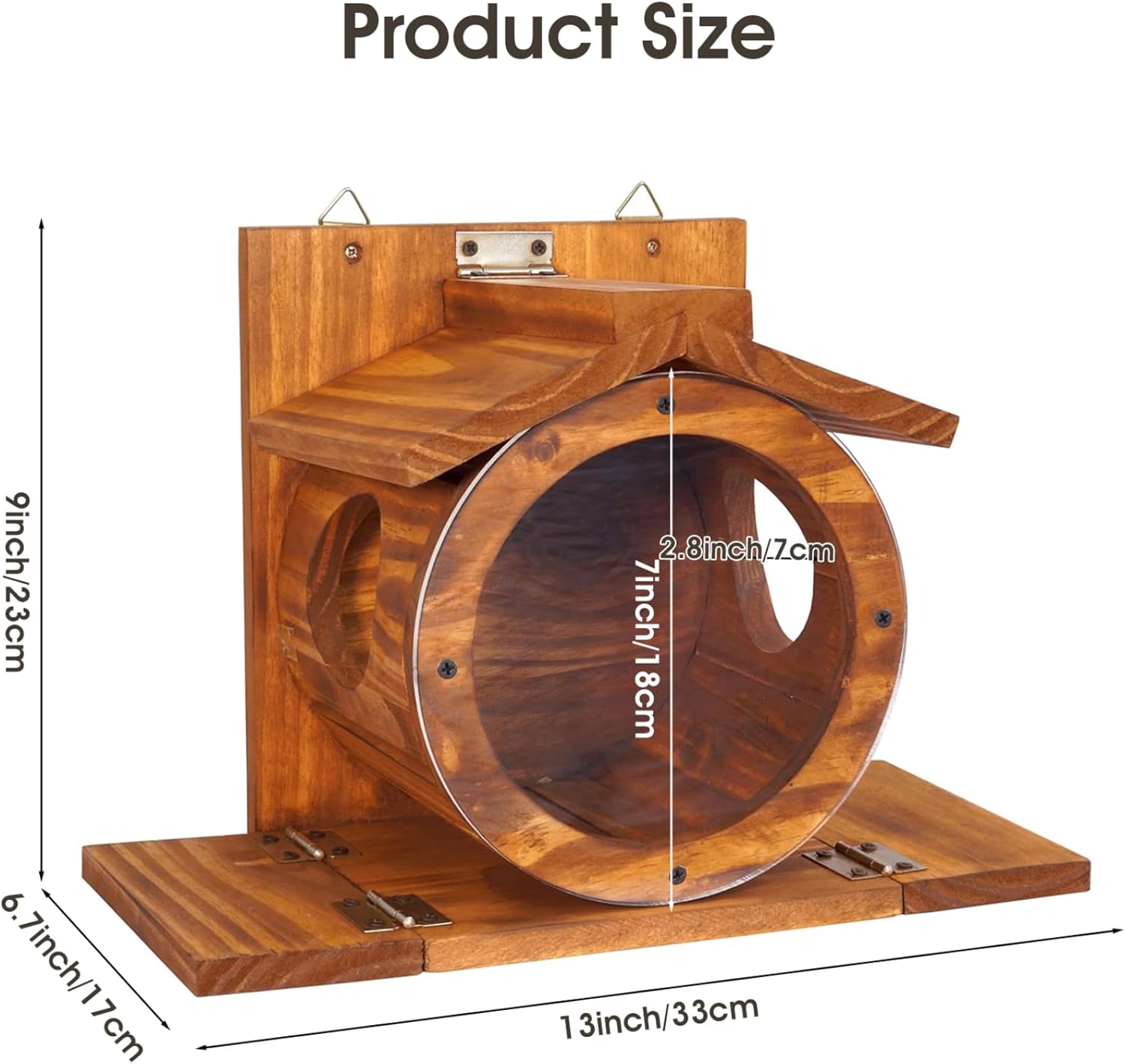 Description: This wall-mounted wooden squirrels feeder brings a weather-resistant design perfect for outdoor use on trees, fences, and walls, blending naturally into your garden environment. Featuring a visible front panel, it allows you to easily monitor the food supply to keep your squirrels comfortably fed without unnecessary disturbance. The spacious feeding box holds enough feed to accommodate several squirrels at once, reducing the need for constant refilling and supporting consistent wildlife interaction. Installation is straightforward, requiring minimal effort and tools, making it convenient for any outdoor setting. Crafted with safety in mind, the feeder has smooth edges and an enclosed space that protects squirrels while allowing easy access to food, encouraging natural feeding habits and frequent visits. This squirrels feeder is an ideal addition for outdoor enthusiasts looking to support local wildlife with a reliable, safe, and easy-to-use feeding station. Features:. -Color: Brown. -Material: Wooden. -Size: about 13x6.7x9 inch. Note:Manual measurement, please allow slight errors on size.The colors may exist slight difference due to different screens. Package Including 1 x Squirrels Feeder