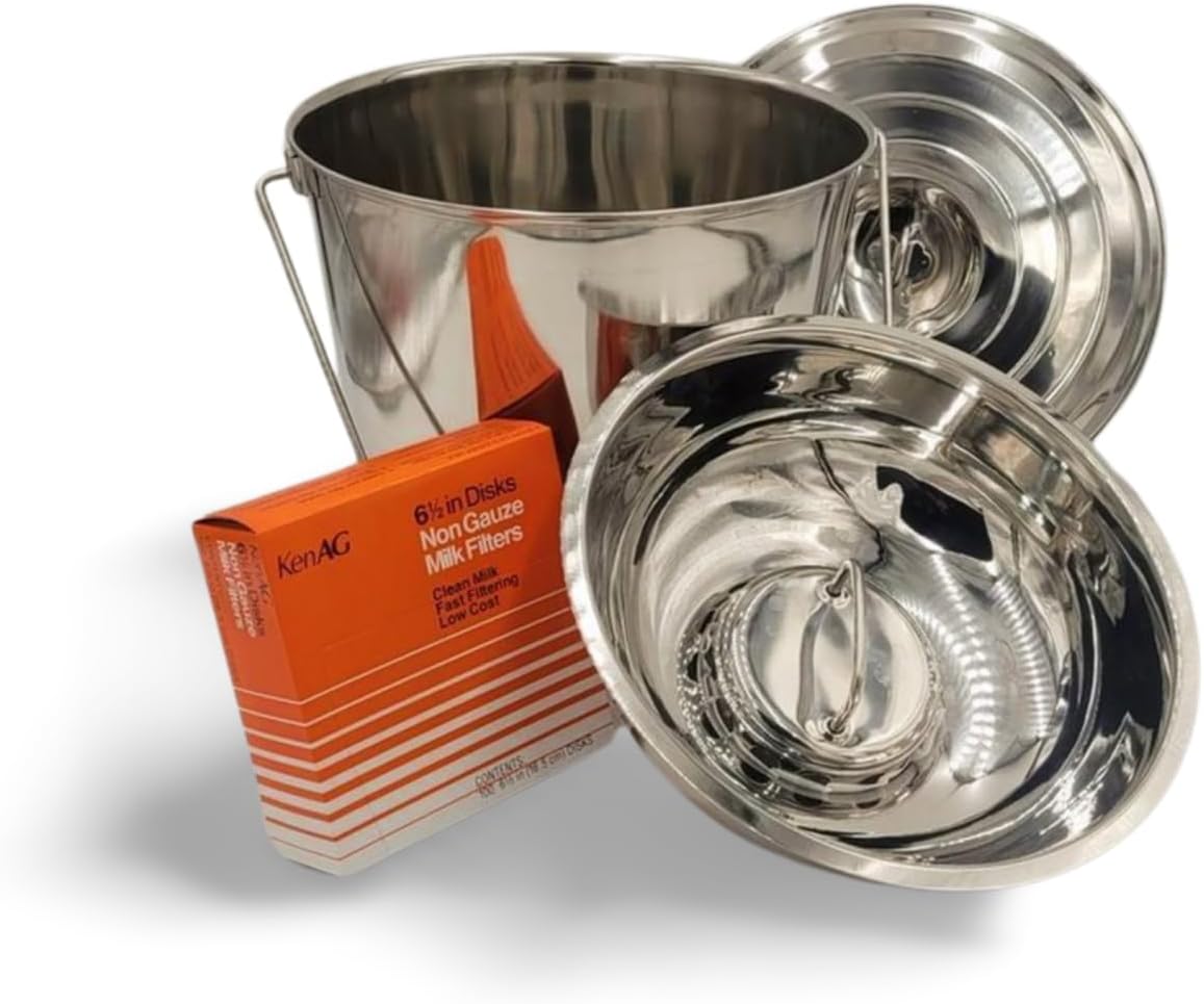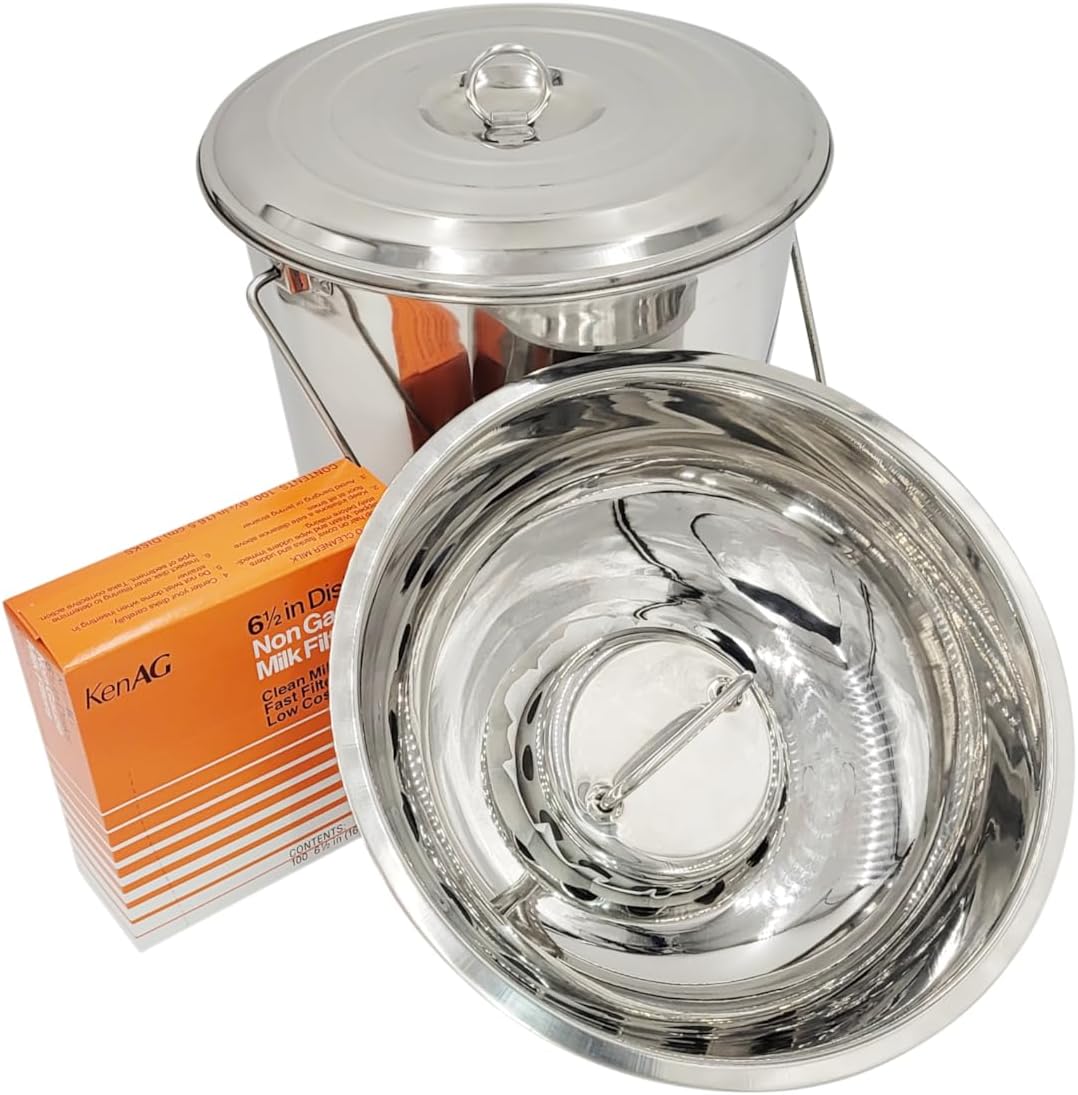 SS STRAINERS Mini Strainer 2” for regular mouth jars (top diameter 5.5", bottom diameter 2.125"/ vol:1 pint); Medium Strainer for large mouth jars (top diameter 11.5", bottom diameter 3"/ vol: .75 gallon); Large Strainer (13” top diameter, bottom diameter 5”/ vol: 2.1 gallon); New/Improved Large Strainer (top diameter 13", bottom diameter 5"/vol. 1.5 gallon); Extra Large Premium Strainer (13.75" top diameter, bottom diameter 6.5" / vol: 3 gallon) Combos include the medium strainer, a pack of filters and the respective size jar.