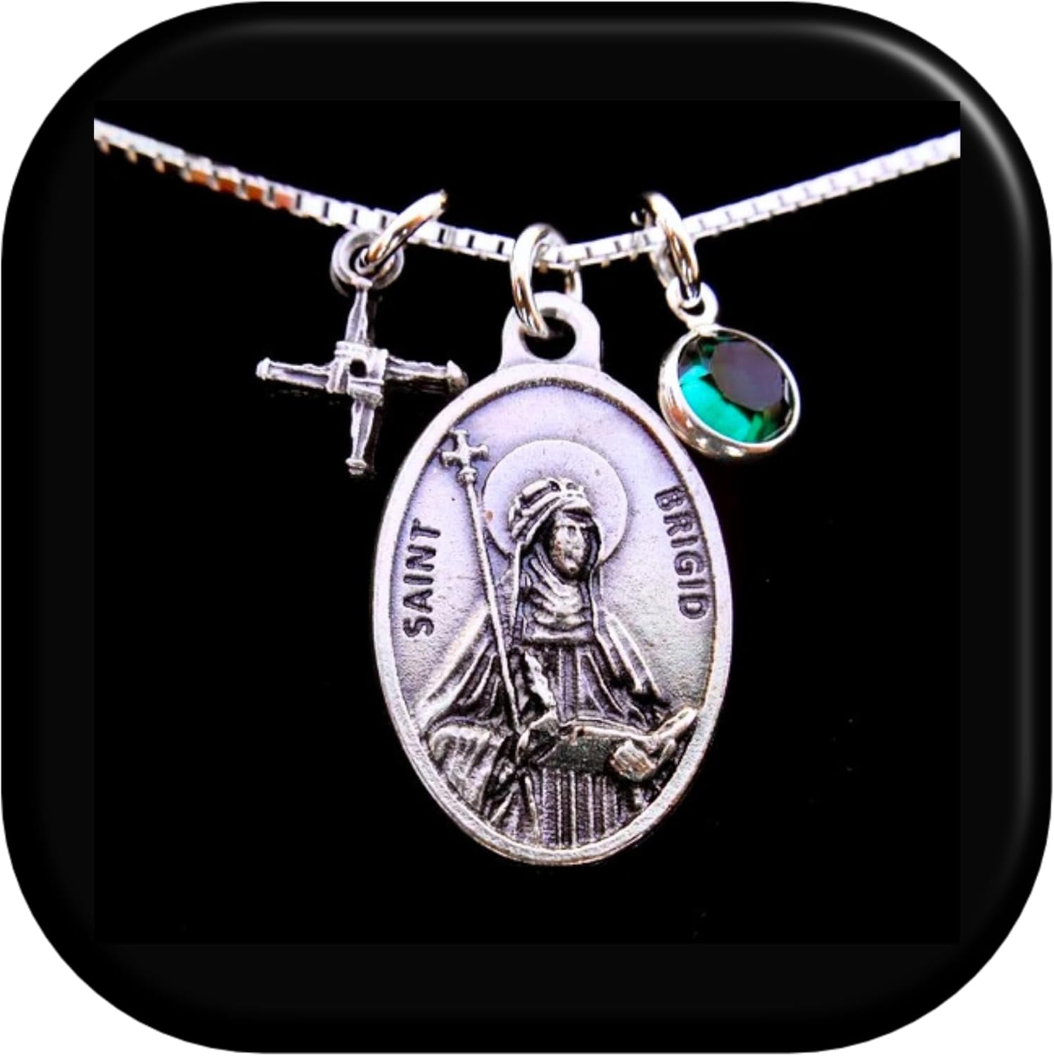 Saint Brigid of Kildare Tiny St. Brigid Cross & Birthstone Elegant Sterling Silver 18” Box Chain Choose Birthstone drop down menu. (See Photo for reference). Solid Sterling Silver Box chain made in Italy with 10mm rectangular clasp. Saint Medal Made in Italy. Metal Alloy, High quality medals. Size: 22×15mm (1″ tall) Swarovski Birthstone Drop Charms. Comes in a gift box ready for giving.