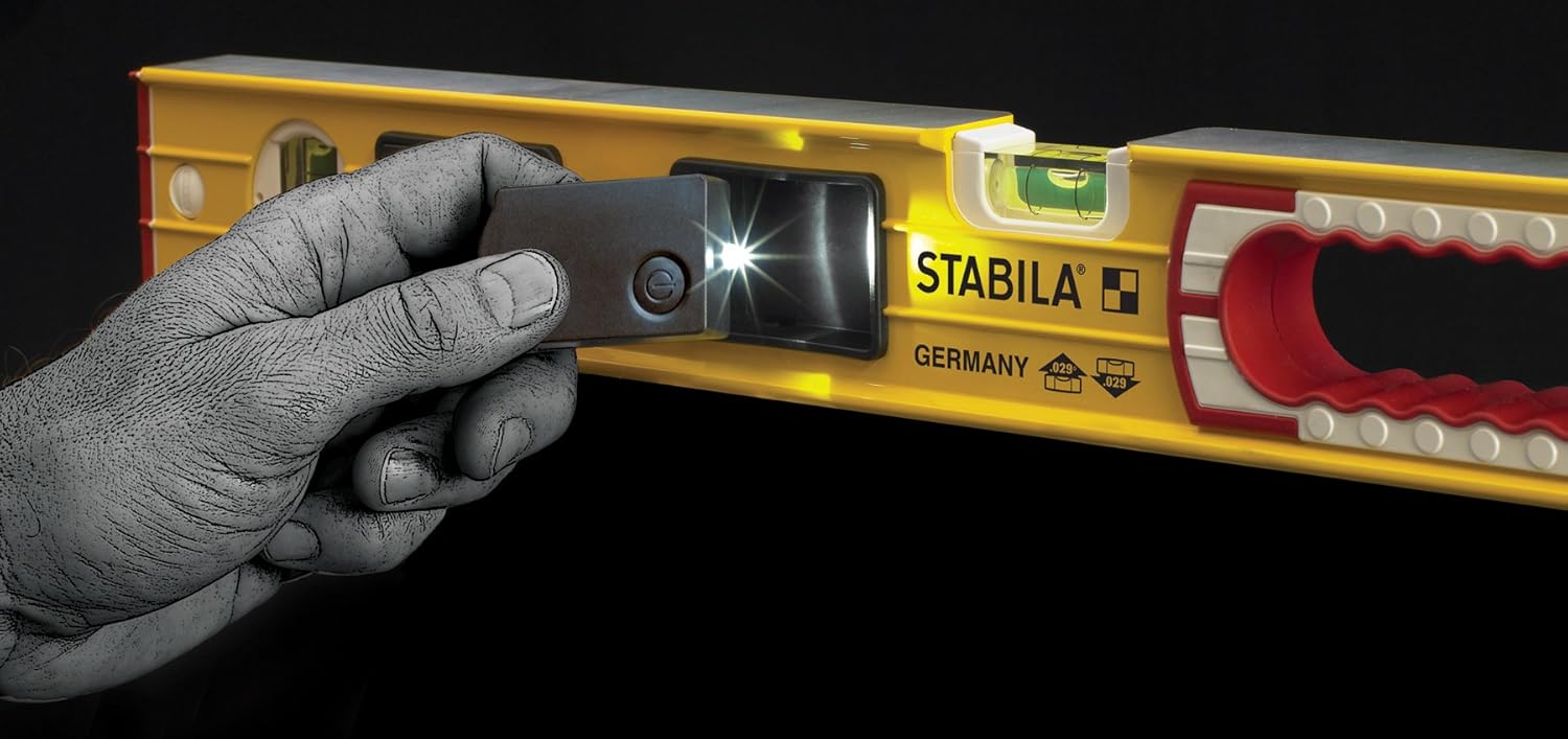 The Stabila The Lights Level Kit Type-196 LED is versatile enough to work in a variety of conditions. The box-beam levels two light packs illuminate the vials so you can read them no matter how low the lighting is at your jobsite. The packs require a single AAA battery to run for up to five hours continuously or for around 600 measurements. You can remove the Stabila levels light packs and use them as standalone flashlights for extra versatility. A single horizontal vial and two vertical vials let you take both level and plumb measurements. This level has two hand grips for ergonomic comfort while you take your readings.